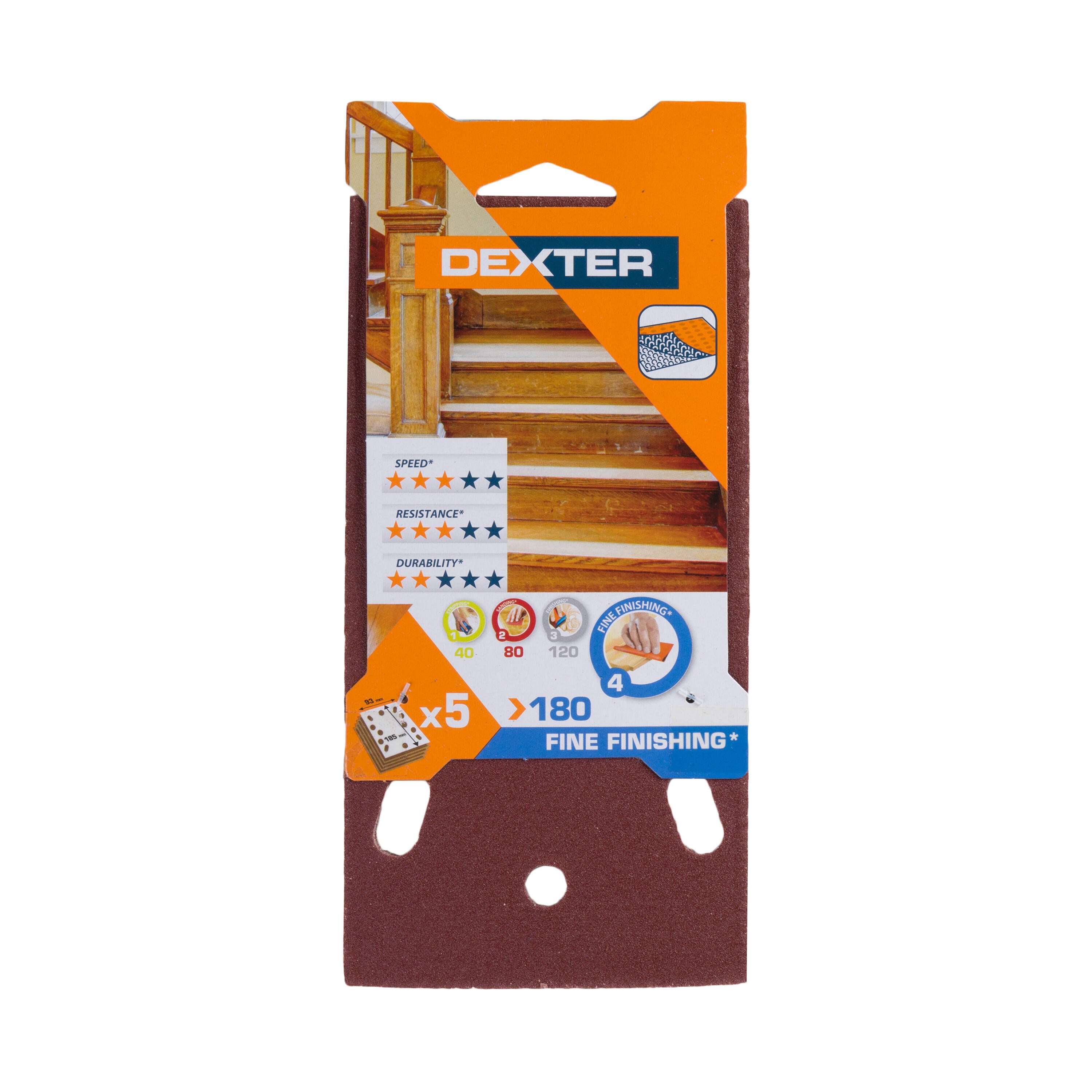Lot de 5 papiers abrasifs, DEXTER, l.93 x L.185 mm grain 180