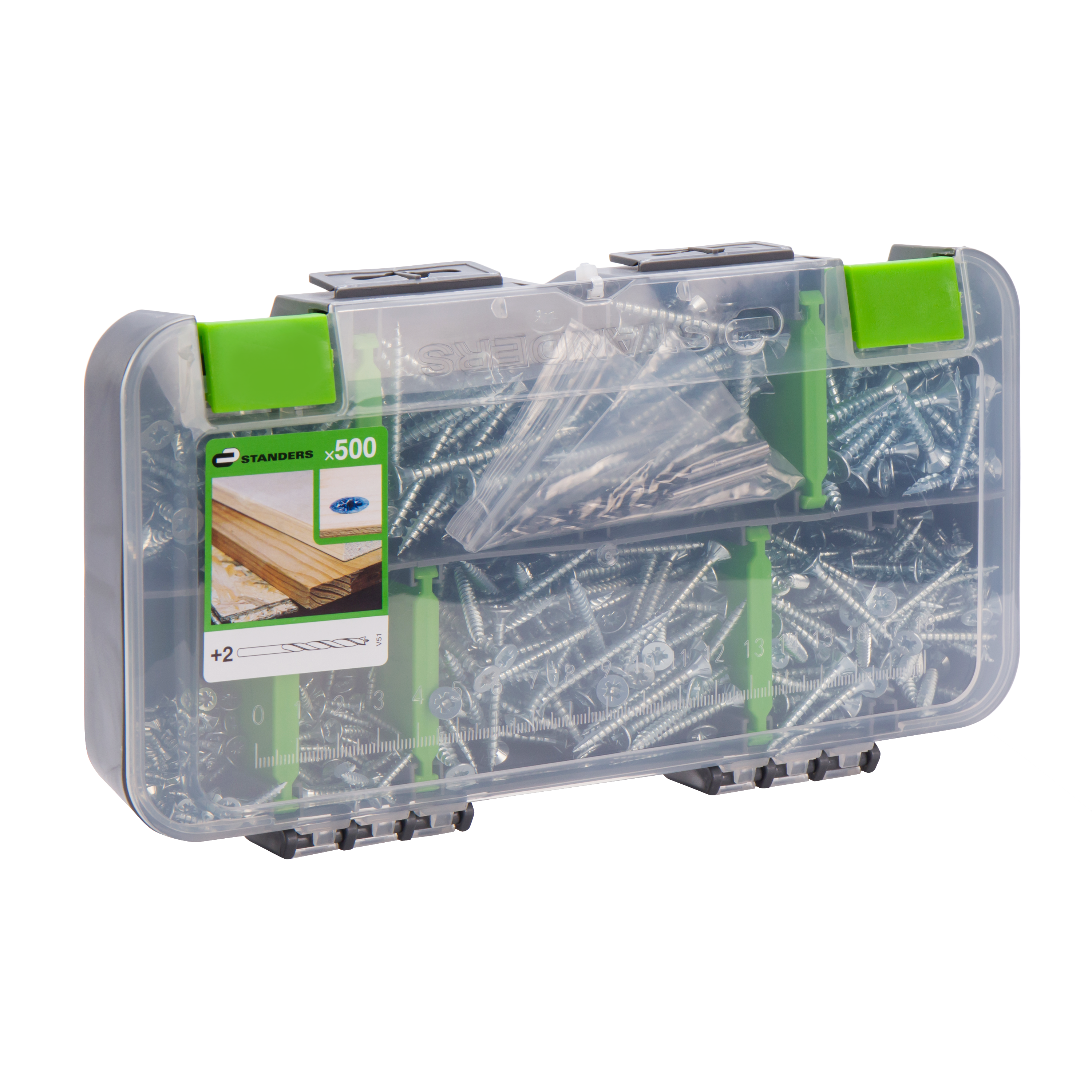 Cette boîte contient 500 vis à bois de 3 à 5 mm de diamètre et de différentes longueurs. Il est utile d'avoir toujours à portée de main les tailles de vis les plus courantes. Grâce à leur tête fraisée, la finition de ces vis sera plate et discrète. Ces vis auto-perceuses pour bois tendre et aggloméré sont idéales pour les petits travaux d'intérieur. Vous gagnerez du temps car le pré-perçage n'est pas nécessaire dans les bois tendres. Pour les bois plus durs, cette boîte contient également deux forets de 3 et 4 mm pour le pré-perçage. La boîte elle-même a été conçue pour servir d'organisateur afin de ranger toutes les vis au même endroit, avec des compartiments séparés pour chaque taille de vis. La boîte peut être fermée en toute sécurité grâce à des loquets en plastique. Le couvercle transparent dispose d'une règle graduée pour vérifier la taille des vis et il permet de voir tout le contenu de la boîte sans l'ouvrir.