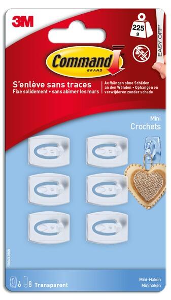 Les crochets et languettes transparents Command™ se fondent dans le décor, pour mettre en valeur ce qui est le plus important, l'objet ou la décoration et non le système de fixation. Fini les clous, les vis et les punaises, les crochets transparents Command™ s'accrochent facilement et solidement sur différents supports (surfaces peintes, en bois, carrelées, et plus encore …). Ne colle pas sur le verre. De plus, ils s'enlèvent proprement en ne laissant ni trou, ni marque, ni résidu collant. Si vous souhaitez déplacer les crochets, il suffit d'appliquer une nouvelle languette transparente adhésive Command™ qui vous permettra de les fixer et les réutiliser à volonté !