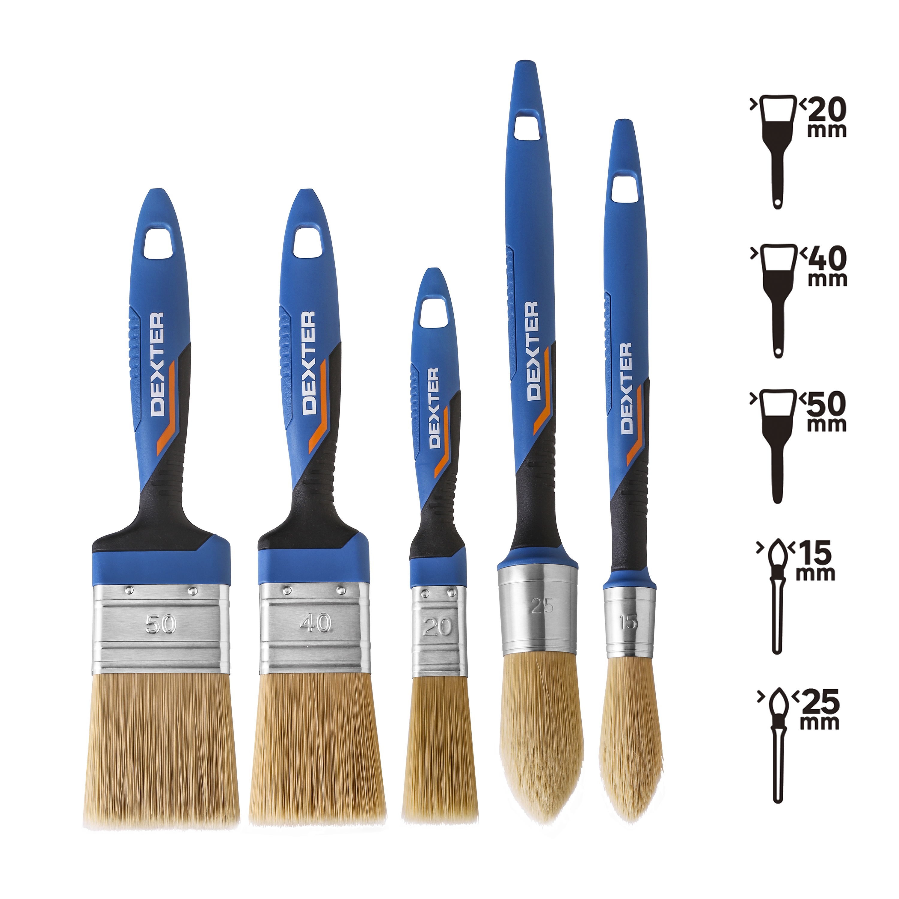 Ce lot polyvalent Dexter comprend trois pinceaux plats (20 mm, 40 mm, 50 mm) et deux pinceaux à rechampir pour les angles (15 mm, 25 mm), adaptés à tous vos projets peinture. Fabriqués avec des matériaux de qualité, ils garantissent des résultats précis et durables.