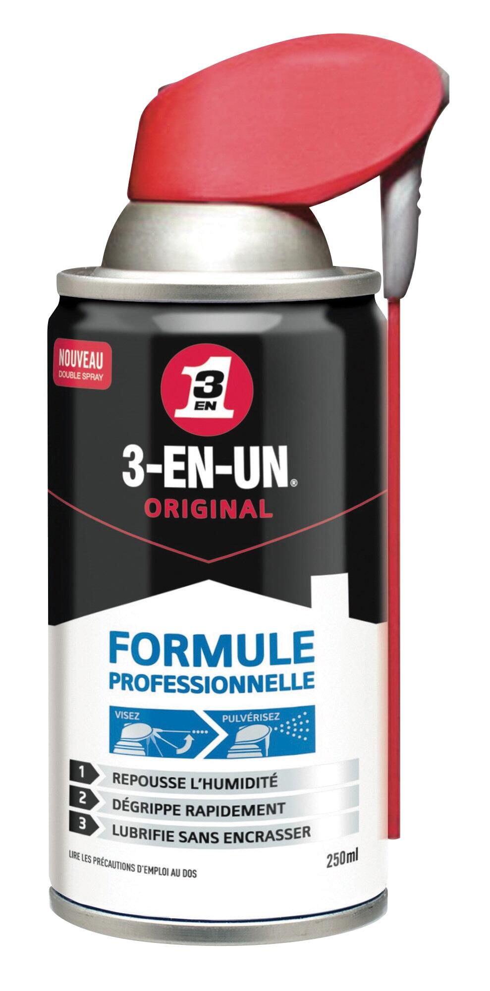 3-EN-UN® ORIGINAL Formule Professionnelle est idéal lorsqu’une protection particulière est requise. Grâce à sa fonction hydrofuge, il permet de repousser l’humidité et de rétablir les contacts. Sa formule se glisse sous les particules de rouille et rend les surfaces propres et nettes. Son pouvoir dégrippant et lubrifiant instantané permet de libérer rapidement les pièces bloquées. Equipée d’un dispositif “double spray” unique et exclusif, elle offre deux positions d’application ajustables en un seul geste : pulvérisation large lorsque le tube prolongateur est abaissé (ex. : protection d’un moteur, nettoyage de surfaces métalliques…) et application précise lorsque le tube est relevé (ex. : la lubrification d’une charnière, serrure ou le déblocage d’une pièce rouillée).