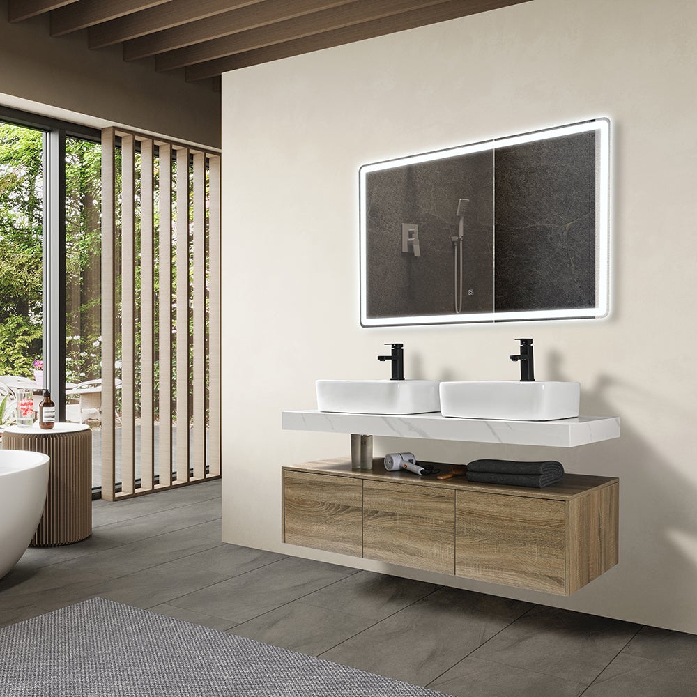LuxuryBain - Meuble de salle de bain double vasque 140cm bois et effet marbre avec miroir led