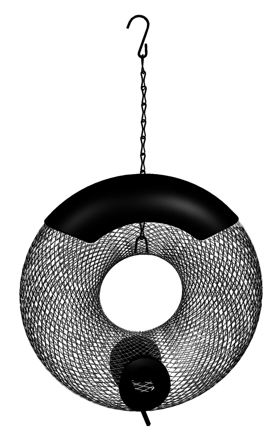 Mangeoire en métal, à suspendre, munie d'un toit de protection pour mélange de graines.