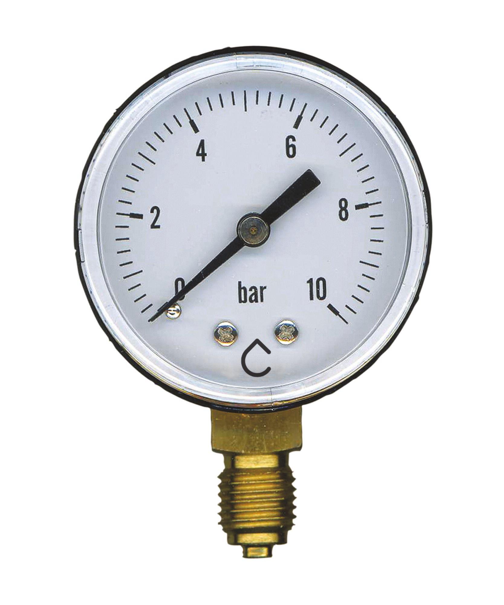 Manomètre sec à raccordement radial Mâle 8/13 (1/4") en laiton pour une meilleure durabilité dans le temps. Mesure de 0 à 10 bars. Précision classe 1,6 répondant aux exigences de la norme DIN 16005. Pour fluide non corrosif entre -20°C à +60°C. Boîtier ABS anti-choc. Cadran Ø50mm. Verre en plexiglas.