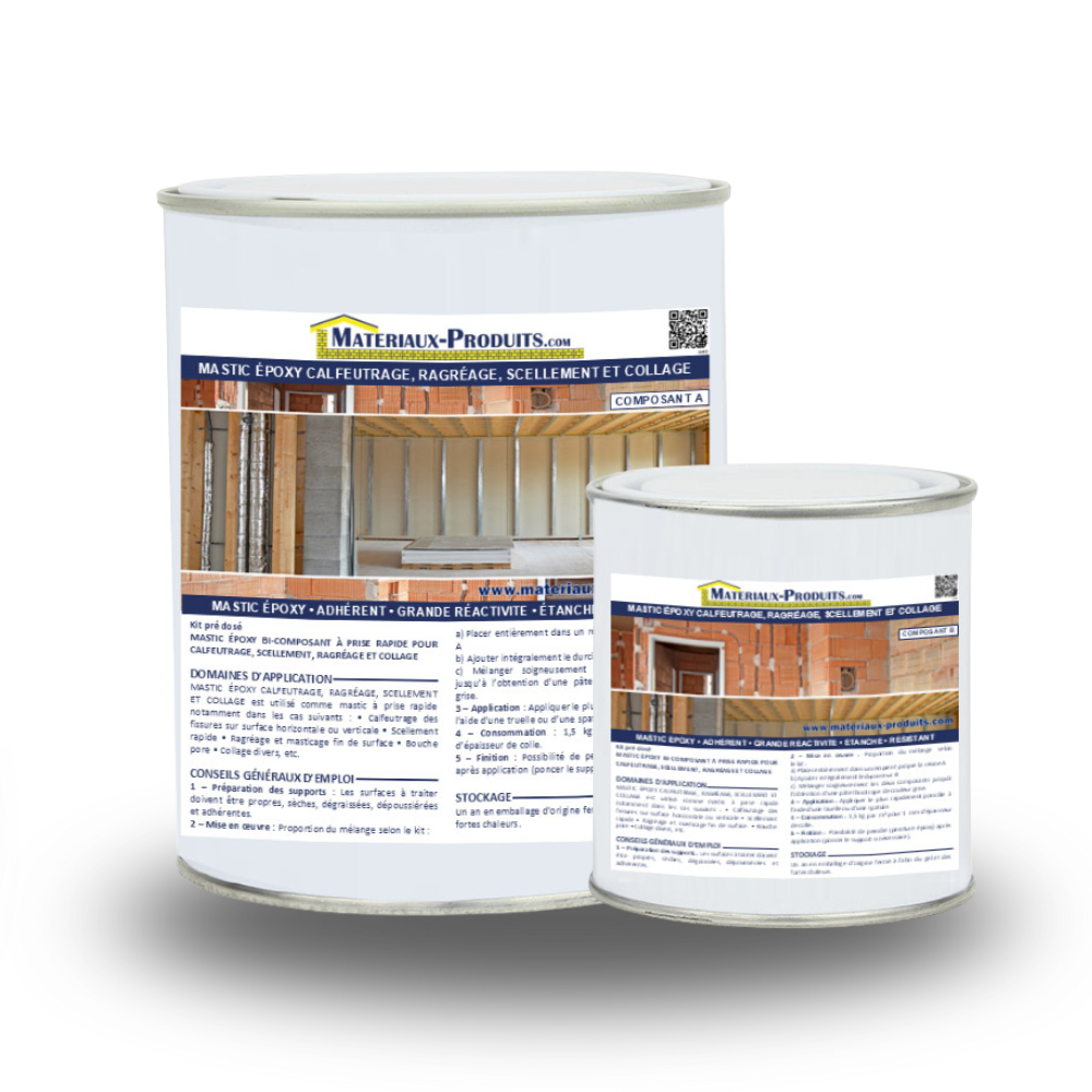 DESCRIPTIF DE MASTIC ÉPOXY CALFEUTRAGE, RAGRÉAGE, SCELLEMENT ET COLLAGE_Ce Mastic à prise rapide permet de calfeutrer rapidement des fissures sur des surfaces horizontales comme verticales. Il peut également être utilisé pour le ragréage et le masticage des fins de surfaces. Ce produit à base d'Époxy à 2 composants, se présente sous la forme d’un Kit prédosé contenant Résine et Durcisseur. Ne pas diviser la quantité de A et de B, afin de garantir la bonne proportion entre ces composants et donc un séchage correct. AVANTAGES DE MASTIC ÉPOXY CALFEUTRAGE, RAGRÉAGE, SCELLEMENT ET COLLAGE_• Prise rapide• Trés fort pouvoir de scellement, fixation et collage sur de nombreux supports• Bonne adhérence sur supports humides non ruisselant• Résiste aux agents chimiques usuels dans des conditions normales d’utilisation• Possède des performances mécaniques élevées• Étanche aux liquides et à la vapeur d'eau• Fabriqué en France DOMAINES D'APPLICATION DE MASTIC ÉPOXY CALFEUTRAGE, RAGRÉAGE, SCELLEMENT ET COLLAGE_Ce Mastic est utlisé dans les cas suivants :• Calfeutrage des fissures sur surface horizontale ou verticale,• Scellement rapide,• Ragréage et masticage fin de surface,• Bouche pore,• Collage divers, etc. Il adhère sur de nombreux supports tels que : béton, mortier, brique, pierre, fibres-ciment, métal, bois, etc.