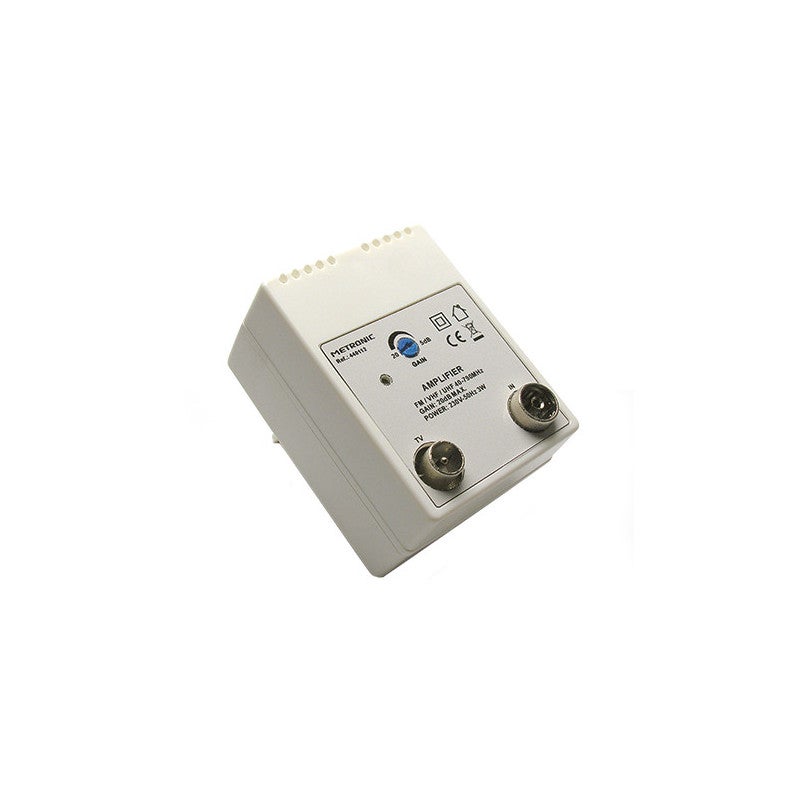 Amplificateur Metronic 1 entrée/1 sortie 20 dB. Gain réglable jusqu'à 20 dB, réception FM/UHF/VHF (40-790 MHz). Filtre LTE/4G intégré pour un signal stable. Alimentation compacte 230 V et connecteur F. Entrées/Sorties : 1 entrée/1 sortie. Fréquence : 40-790 MHz. Gain : jusqu'à 20 dB. Filtre : LTE/4G. Alimentation : 230 V. Connecteur : F 9,52 mm.