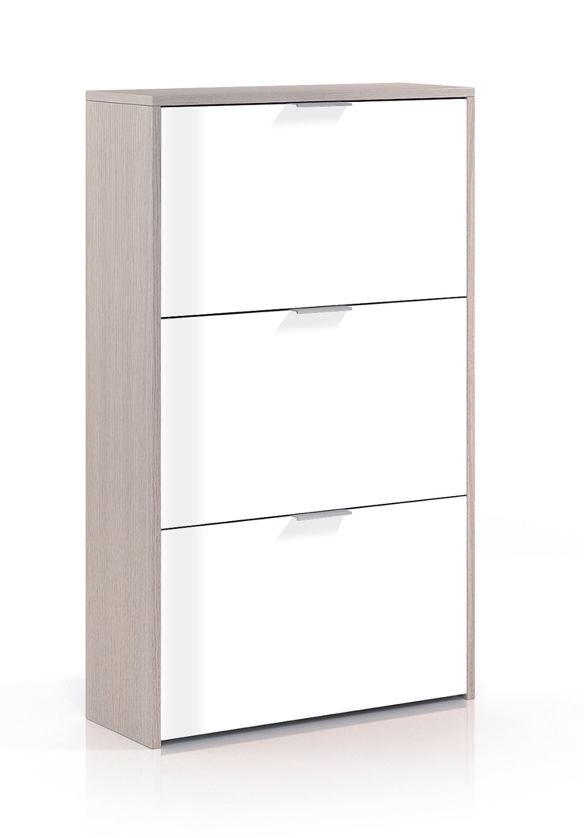 Meuble à chaussures avec 3 abattants coloris Blanc Alpes et basalte en mélaminé, Poignée en métal. Ce meuble à chaussures plein d'originalité sa capacité approximative est de 18 paires de chaussures ! Livré en kit. Dimensions: 113 x 60 x 22 cm. Matières: MDF. Couleur: chêne et blanc Brillant