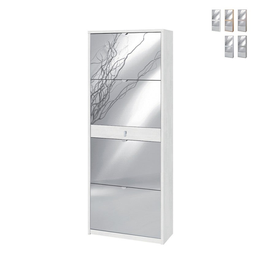 Meuble à chaussures 4 portes, panneau de particules mélaminé, épaisseur de la structure 18 mm, épaisseur des tiroirs et des portes 16 mm avec miroir, côtés et dessus visibles, bord ABS sans angle vif