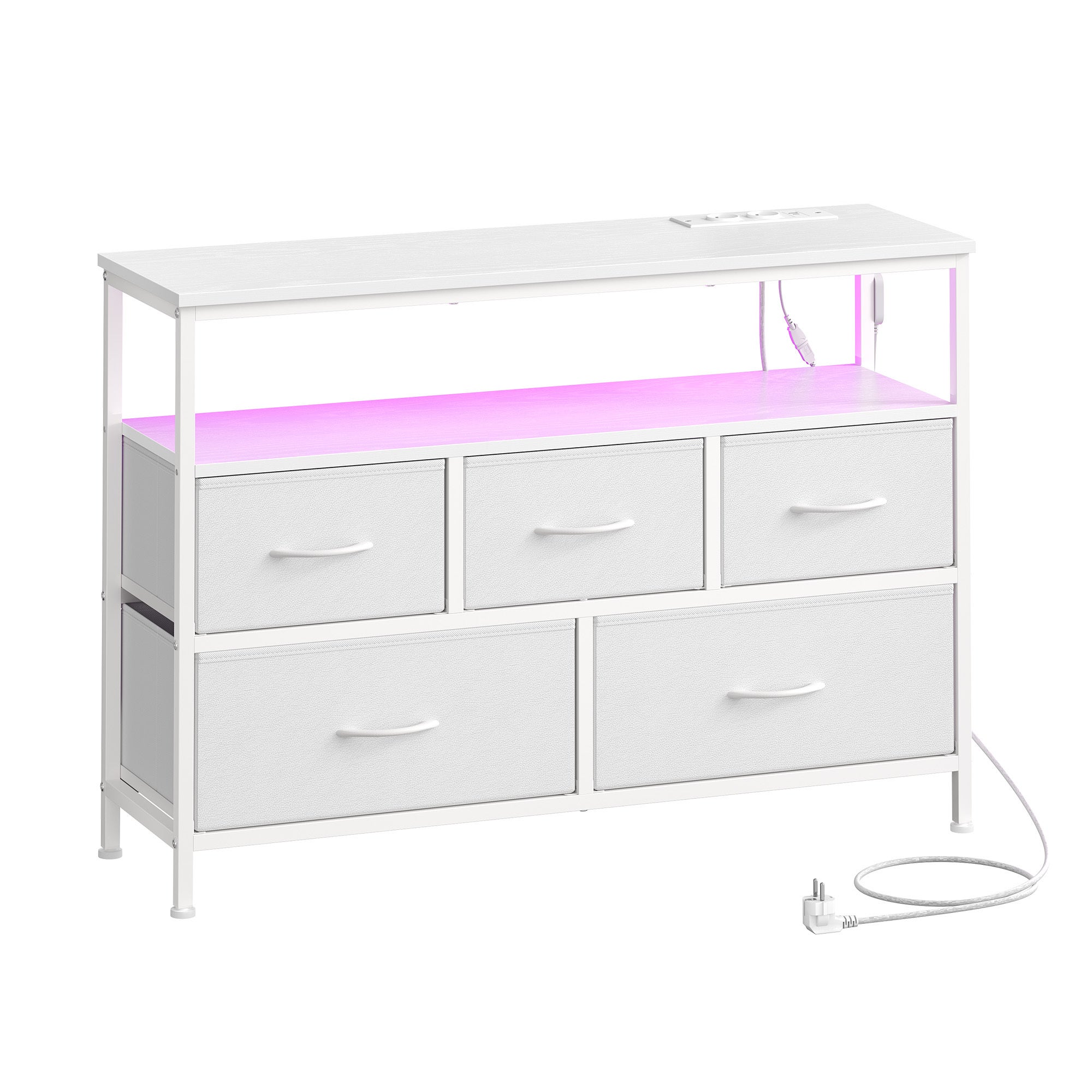 Meuble de Rangement avec LED Réglable et Multiprise, 5 Tiroirs en Tissu, Style Moderne, Chambre, Blanc