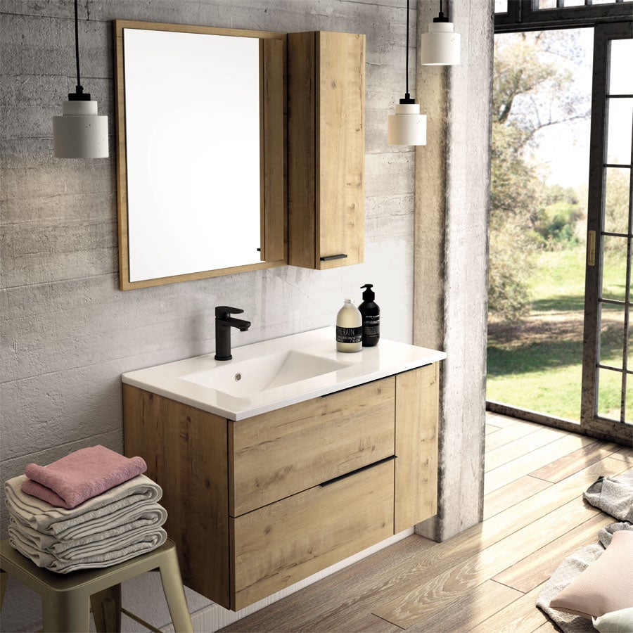Meuble de salle de bain 80cm vasque déportée - 2 tiroirs - miroir avec armoirette - KING - Roble (chêne clair)