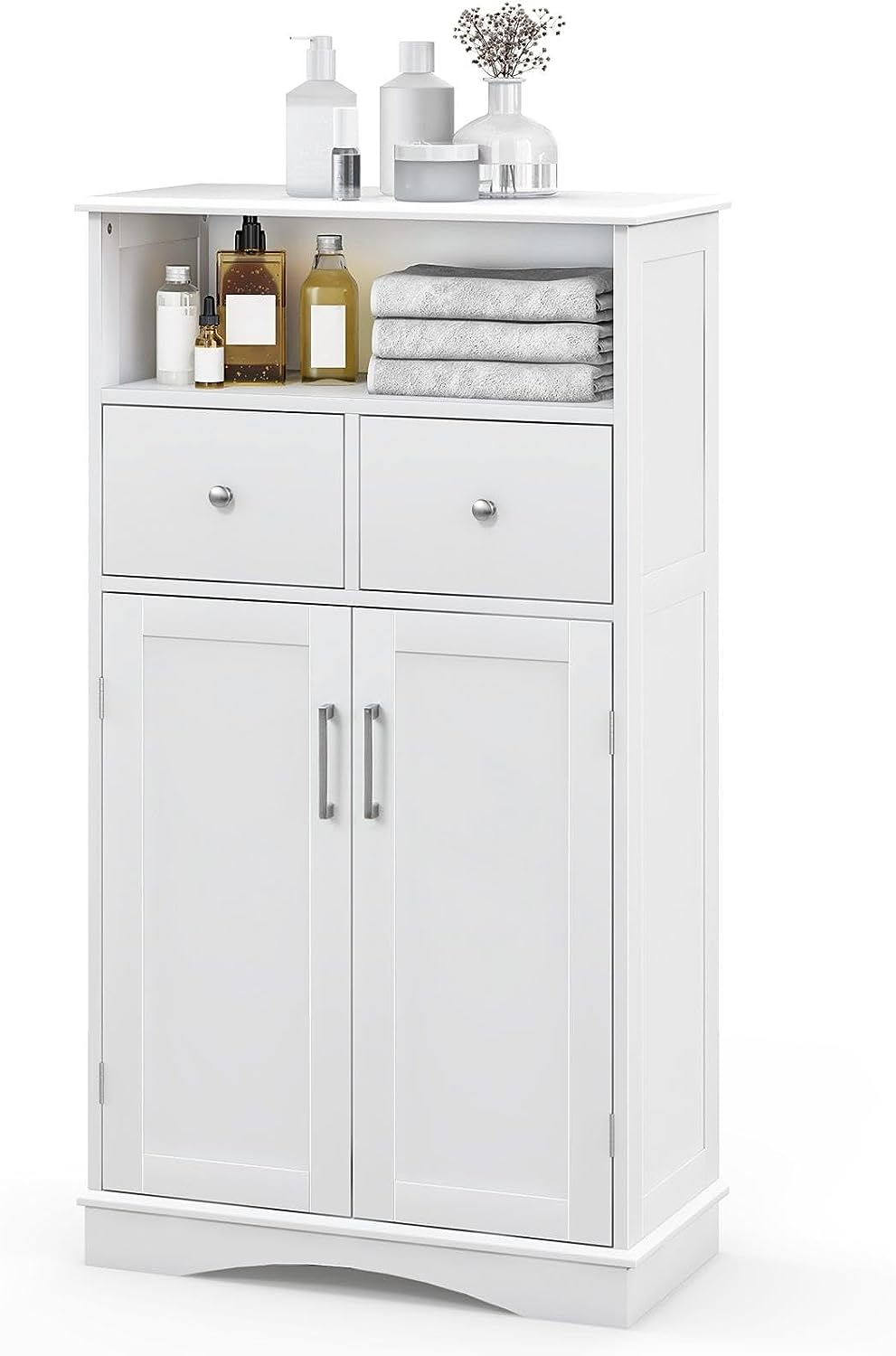 - Cette armoire autoportante comprend à la fois un espace de rangement ouvert et fermé, et est équipée d'un plateau spacieux, d'un compartiment de rangement ouvert, de 2 tiroirs et d'une armoire pour ranger divers articles. De plus, les étagères à l'intérieur de l'armoire peuvent être ajustées à 3 hauteurs vous permettant de le les adapter librement aux articles de différentes hauteurs. Pour plus de sécurité, elle peut être fixée au mur avec des dispositifs anti-basculement inclus. Elle est idéale dans la salle de bain, le salon, la cuisine, et le bureau.