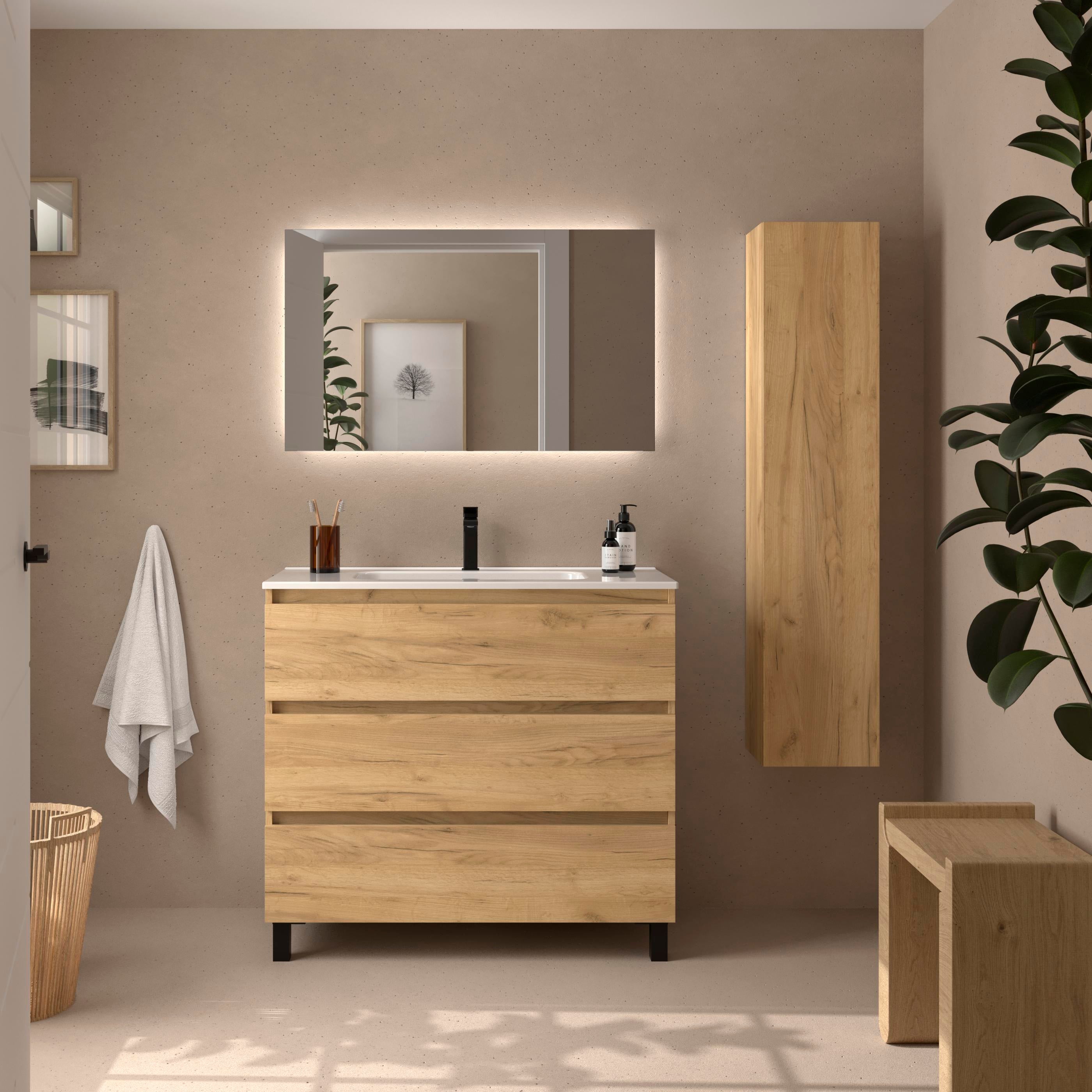 Meuble de salle de bain BEQUIA 3C 100cm Chêne | Vasque Porcelaine Centrale