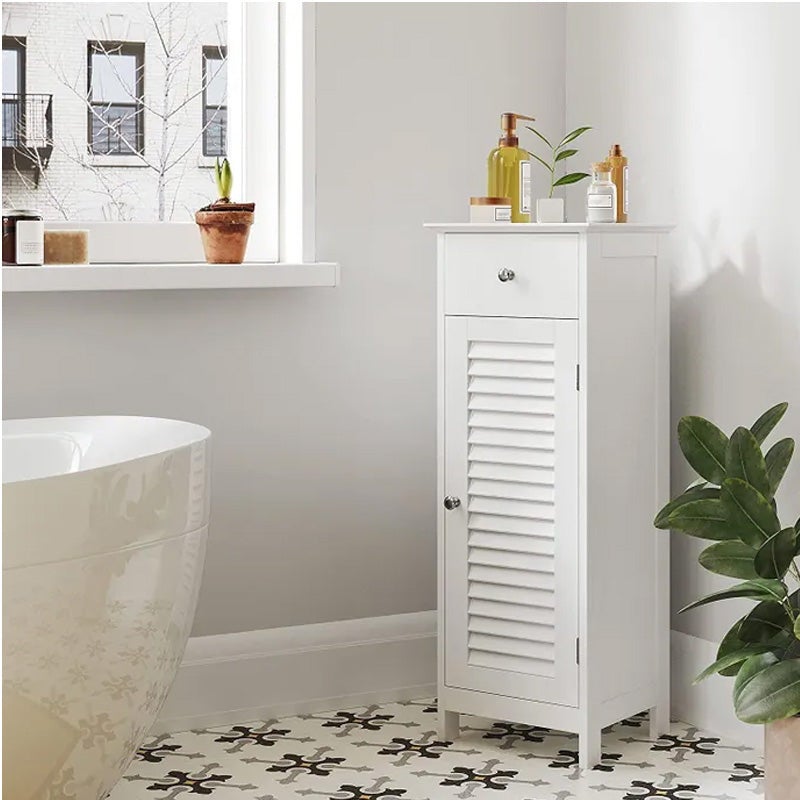 Meuble de salle de bain - Vasagle - BBC43WT L’armoire de salle de bain BBC43WT de Vasagle est idéale pour optimiser un espace réduit grâce à son format compact et sa conception en angle. Elle offre un tiroir pratique et deux compartiments fermés par une porte à lamelles pour ranger efficacement vos accessoires. Sa finition blanche et ses poignées en métal chromé lui confèrent une élégance intemporelle, adaptée à tous styles d’intérieurs. Fabriquée en panneau MDF résistant à l’humidité, elle est facile à entretenir et durable. La sécurité est renforcée grâce au dispositif anti-basculement fourni. Caractéristiques techniques Meuble de salle de bain - Vasagle - BBC43WT Meuble de salle de bain en panneau MDF (classe E1) avec surface peinte blanche. Dimensions : 32 x 30 x 87 cm. Dimensions intérieures du tiroir : 22,5 x 23,5 x 9 cm. Dimensions de chaque compartiment : 26 x 26 x 30,5 cm. Poids : 8,6 kg. Équipé d’une porte à lamelles, d’un tiroir et de poignées en métal chromé. Type de pose : à poser au sol. Résistant à l’humidité et facile à nettoyer. Ouverture par porte et tiroir. Accessoires inclus Meuble de salle de bain, dispositif anti-basculement, kit de montage, mode d’emploi multilingue.