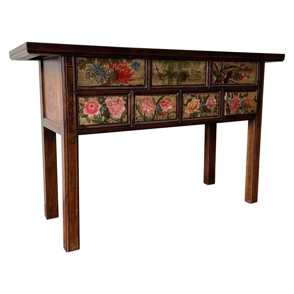 Magnifique grand meuble d'entrée ou console (173,5 cm de large) en bois avec une finition marron artisanale et des détails peints à la main. Mesurant 45 cm de profondeur et 89 cm de hauteur, il offre un généreux espace de rangement et un design chaleureux et unique. Idéal pour créer une entrée impressionnante et sophistiquée.