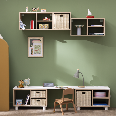 Spaceo KUB est proposé en finitions blanc, vert et effet chêne. La finition pin brut, prêt à peindre, est disponible uniquement sur les meubles à 1, 2 et 3 cases.