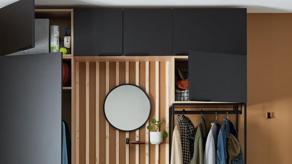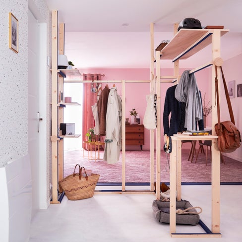 Utilisez un vestiaire d’entrée ou un meuble multifonction combinant penderie, banc et rangements pour manteaux, sacs, casques ou accessoires.