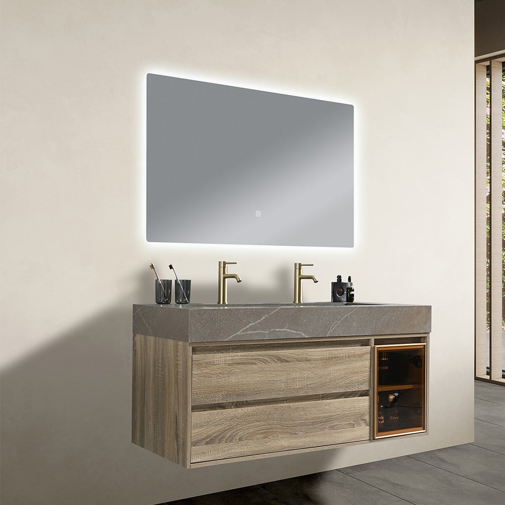 Meuble salle de bain double vasque 120cm bois et effet marbre marron avec miroir LED LB-8512M-120
