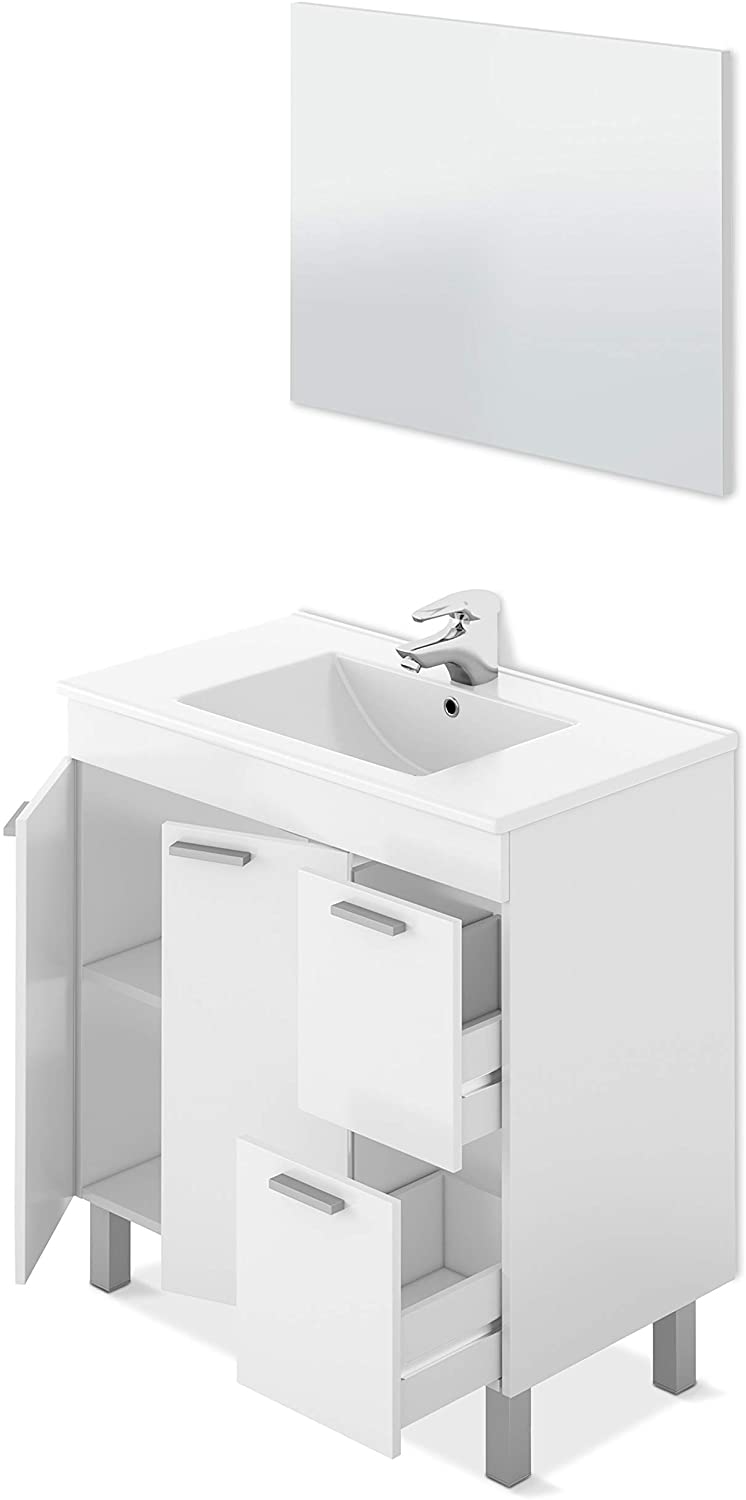 Meuble de salle de bain sous vasque avec 2 tiroirs, 2 portes abattantes et 1 miroir en mélamine. C'est un meuble complet et pratique qui a beaucoup d'espace de rangement. dimension des tiroirs : Longueur 22 x hauteur 13 x profondeur 35 cm avec des poignées finies en gris aluminium. Comprend les supports pour un montage mural. Vasque et robinetterie non incluses. Coloris : blanc brillant. Poids : 33 kg. Dimensions : L80 x H80 x P45 cm. Dimensions du miroir : Longueur 80 x Hauteur 57,5 x Profondeur 1,8 cm. Le dispositif de fixation des meubles au mur sont inclus. (Utilisez la quincaillerie adéquat à votre type de mur). Produit de fabrication Espagnol certifié PEFC.
