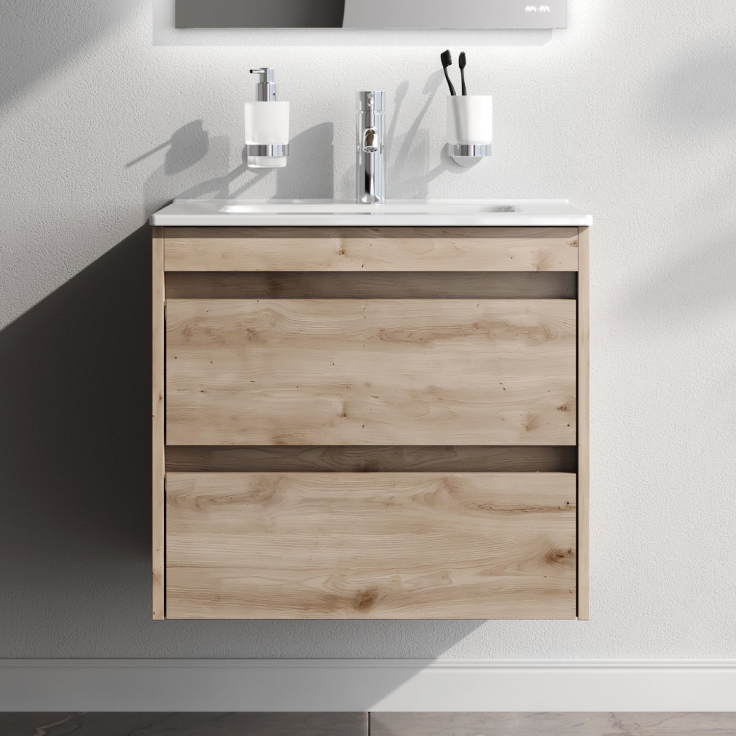 Meuble salle de bains suspendu 60 cm effet bois clair avec lavabo intégré, 2 tiroirs, design, chêne clair texturé – AM.PM