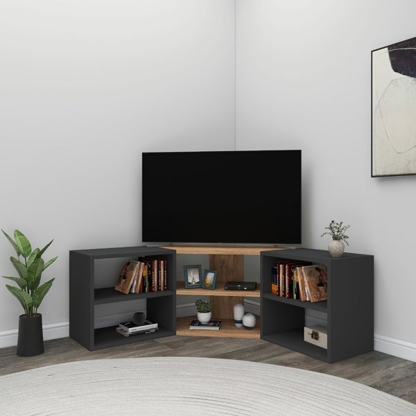 Meuble TV d'angle au design moderne avec compartiments ouverts Chêne et anthracite pour femmes