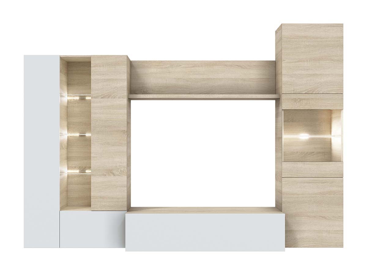 Meuble TV comprend un module bas fermé avec une porte battante pour la télévision. Un module de rangement à quatre trous (trois fermés avec des portes et une pièce avec éclairage LED intégré). Une vitrine avec trois étagères en verre avec éclairage LED intégré (une avec porte cristal) et une étagère murale suspendue. Fabriqué en mélamine blanche brillante et Chêne Canadien. Cet meuble TV s'intégrera parfaitement avec tout type intérieur chic. Livrée en kit. Dimensions: 185 x 260 x 42 cm. Matières: MDF. Couleur: Blanc Brillant et chêne Canadien