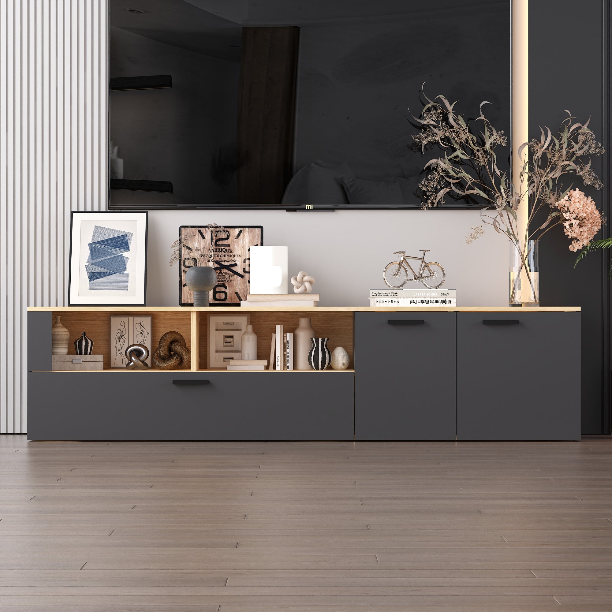 Ce meuble TV allie une finition en gris foncé et des éléments en bois naturel, offrant un style moderne et chaleureux. Il s'intègre facilement dans tous types de salons, que ce soit dans un décor contemporain, industriel ou classique. - Rangement pratique et spacieux