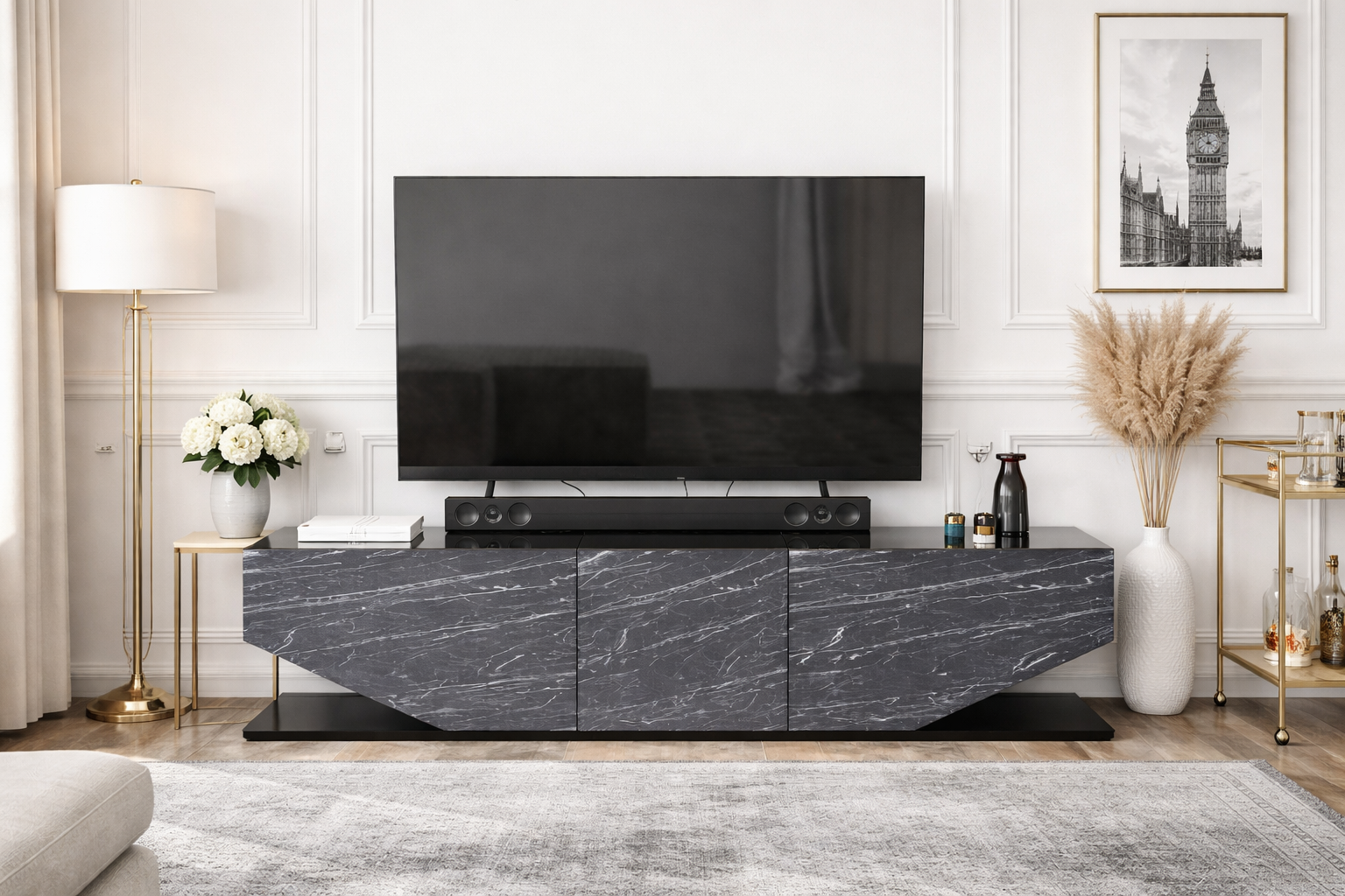 Meuble TV Pearl de 180 cm avec des armoires en style ailes (effet marbre noir)