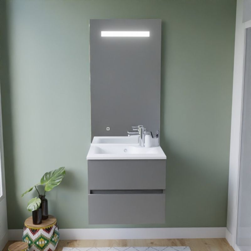 Meuble vasque ROSALY INOX 60 cm + miroir Elégance ht105- Gris- Plan vasque en Résine