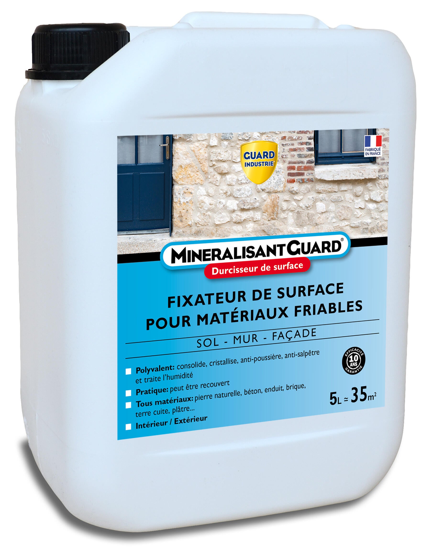 Le Minéralisant Guard durcit et consolide les supports friables détériorés par les infiltrations d’eau, d’humidité, le vieillissement ou les intempéries. Il renforce les matériaux friables comme la pierre, le béton, le plâtre, les enduits ou les mortiers pour que les murs ne s'effritent plus et n'ont plus d'aspect poussiéreux. Il traite aussi les problèmes de salpêtre sur plâtre. Incolore après application, il ne modifie ni la teinte ni la texture du support. Il s’impose donc comme un allié incontournable pour les travaux de rénovation, de conservation ou de préparation avant finition.