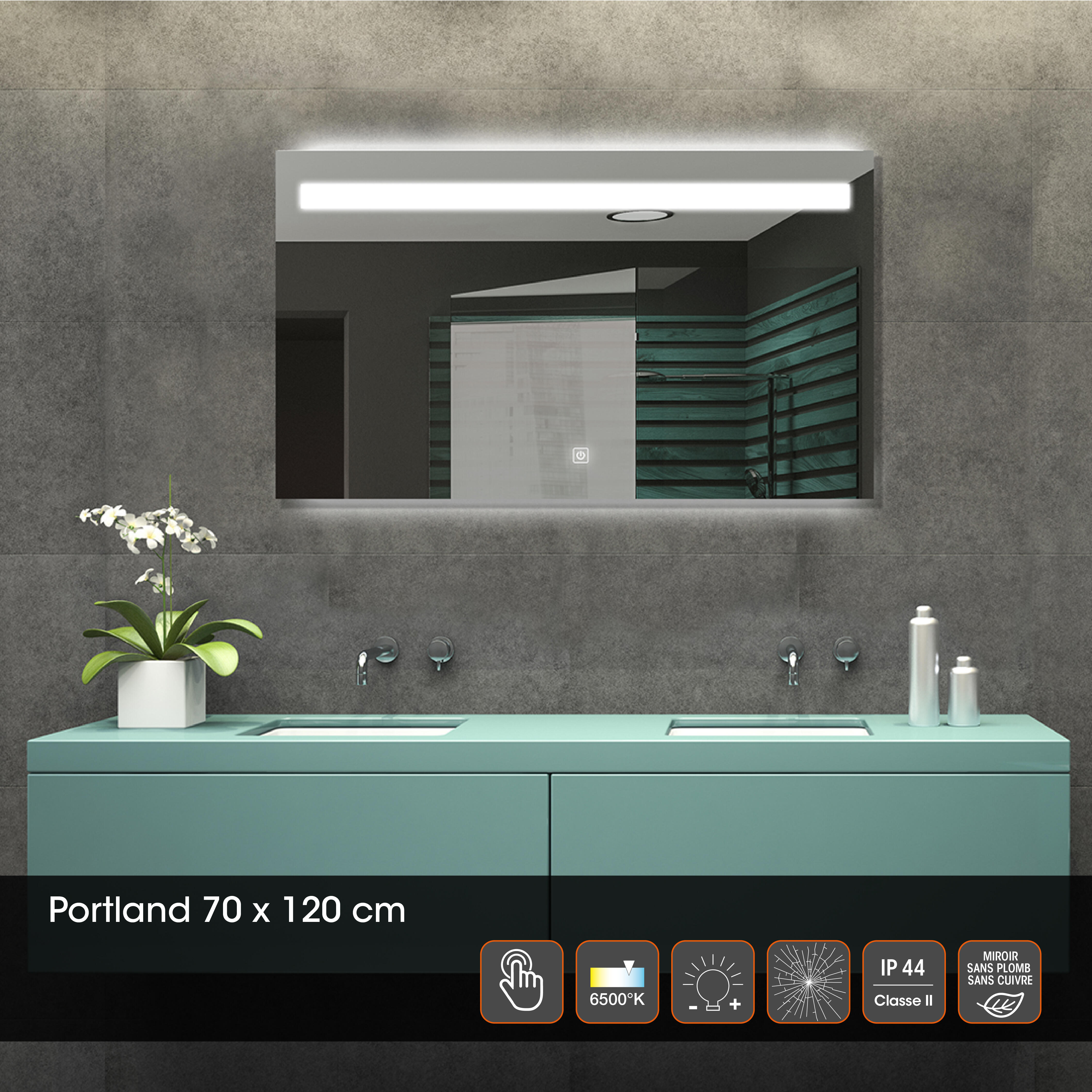 Miroir lumineux l.120 x H.70 cm Portland,Tactile, Variateur intensité et couleur