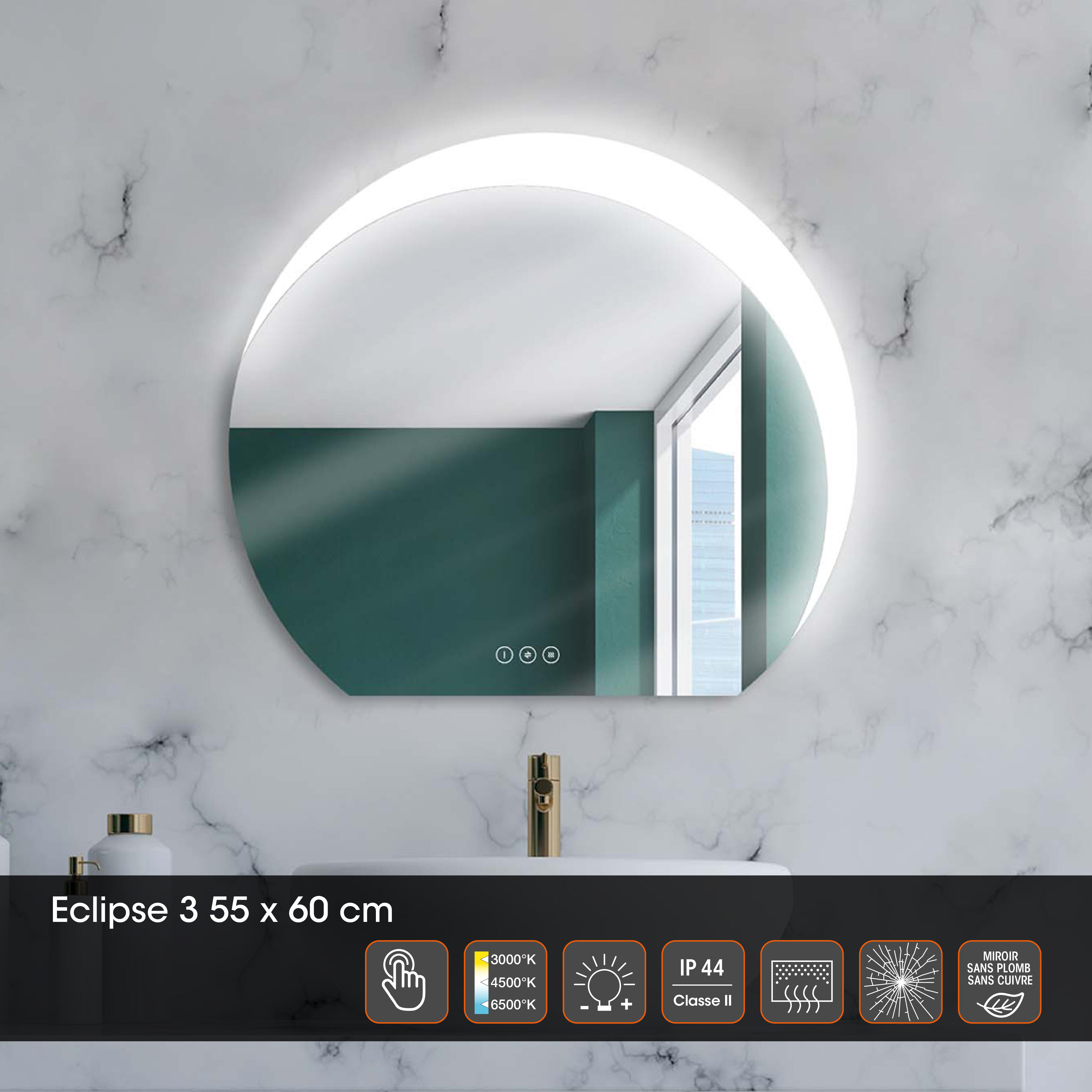 Miroir LED ECLIPSE 3 55X60cm - Eclairage d'ambiance haut - 3 touches sensitives avec interrupteur on/off, variateur d’intensité et de couleurs, fonction antibuée - Film anti-éclat. Ce produit contient une source lumineuse de classe d’efficacité énergétique G.