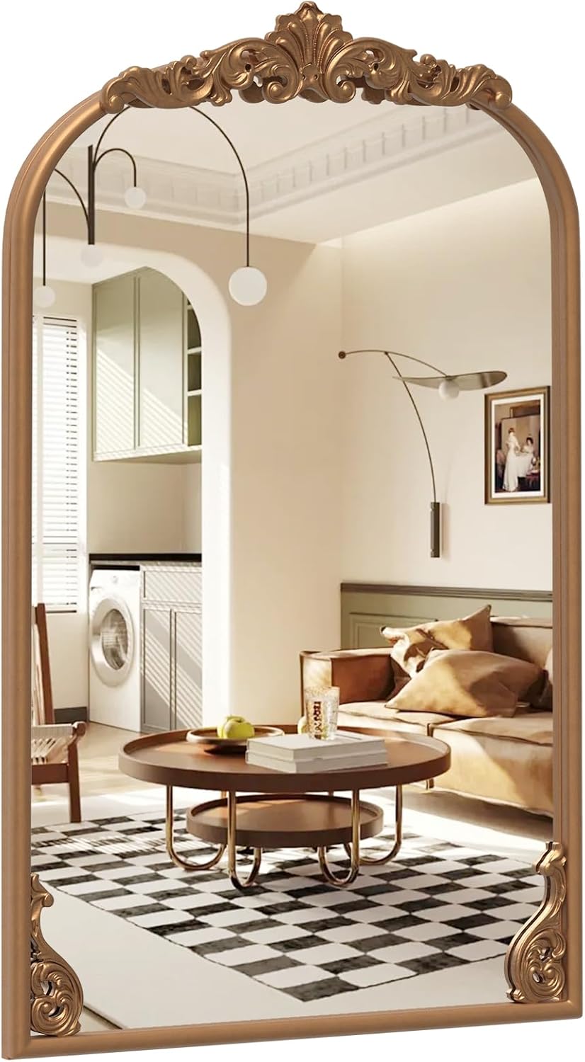 Miroir Mural Doré Vintage, Miroir Arqué Décoratif avec Cadre Baroque Orné, Métal Robuste, Décoration Murale pour Entrée, Salon, Couloir (51x76 cm)
