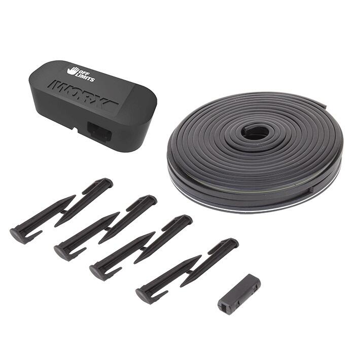Le module Off-Limits eBonjour, lt livré avec 4 bandes de 5 m, 8 connecteurs et 24 piquets d'arrimage. Il est possible d'acheter des longueurs additionnelles. Les bandes magnétiques peuvent être coupées ou au contraire connectées bout à bout pour créer une très grande aire. Le ruban est massif (largeur 9 mm, hauteur 6 mm) mais surtout ne l'enterrez pas. L'herbe le masquera en quelques semaines.