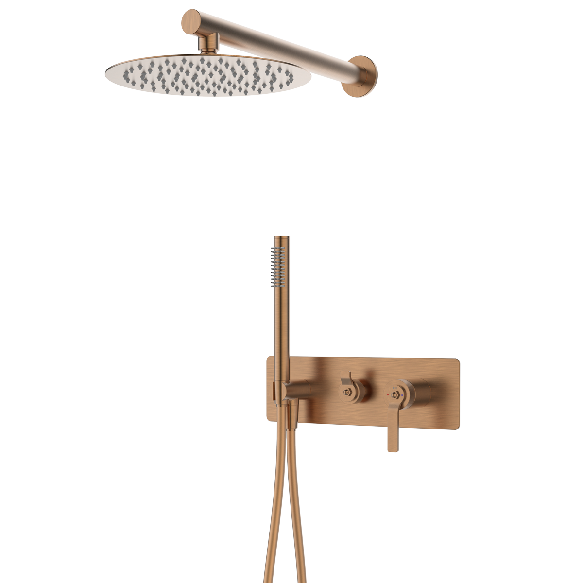 Bras, pomme haute, mitigeur thermostatique, tubes pour installation murale et douchette à main