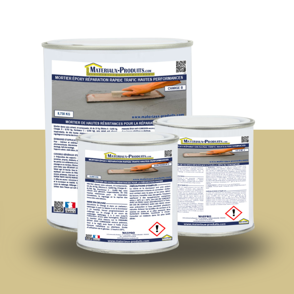 DESCRIPTIF DE MORTIER DE RÉPARATION RAPIDE TRAFIC HAUTES PERFORMANCES_Ce Mortier de réparation permet de réaliser des Chapes étanches, antiglissantes, durables et résistante, pour des sols industriels, anti-poussière et à fort trafic, sur une épaisseur de 3 à 50 mm. C'est un Revêtement Époxydique, sans solvant, et sans retrait, destiné à la réparation de bétons usés ou endommagés, comme par exemple : escaliers endommagés, effritements des joints, différence de niveau, fixation des guide-rails, trous dans les sols, sols usés, bords de quais etc… Ce Mortier est idéal pour combler rapidement et économiquement les trous profonds, pour les réparations immédiates dans les zones à trafic intense, pour réparer les zones sujettes aux mouvements et aux vibrations, pour les applications fines les bords de la réparation peuvent être lissés à 0 . Dans le cas de ragréage et quel que soit l’état du support, appliquer une couche de PRIMAIRE ÉPOXY ANTI CORROSION et sur cette couche encore poisseuse, intervenir dans les 2 heures avec ce mortier. AVANTAGES DE MORTIER DE RÉPARATION RAPIDE TRAFIC HAUTES PERFORMANCES_• Sans joints• Très hautes résistances mécaniques et chimiques• Retour au trafic 3 à 6 heures• Imperméable• 16 teintes• Fabriqué en France DOMAINES D'APPLICATION DE MORTIER DE RÉPARATION RAPIDE TRAFIC HAUTES PERFORMANCES_• Intérieur et extérieur.• Sols industriels : industries agroalimentaires, pharmaceutiques, laboratoires.• Dépôts industriels où le trafic est lourd, halls de stockage, halls de montage.• Supports admis : Dalle béton, béton préfabriqué, chape ciment.