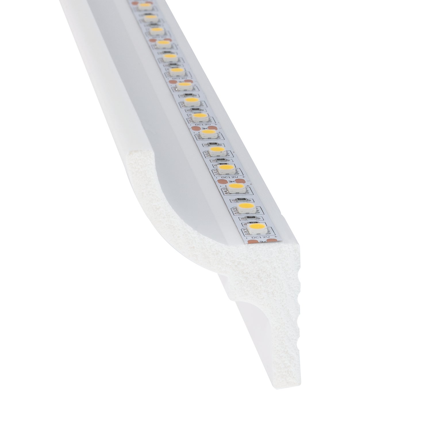La moulure pour Ruban LED est faite de polymère extrusioné à haute densité qui est résistante aux chocs et à l'eau. En raison de sa dureté particulière, ce matériau est idéal pour les plinthes et les moulures de plafond.