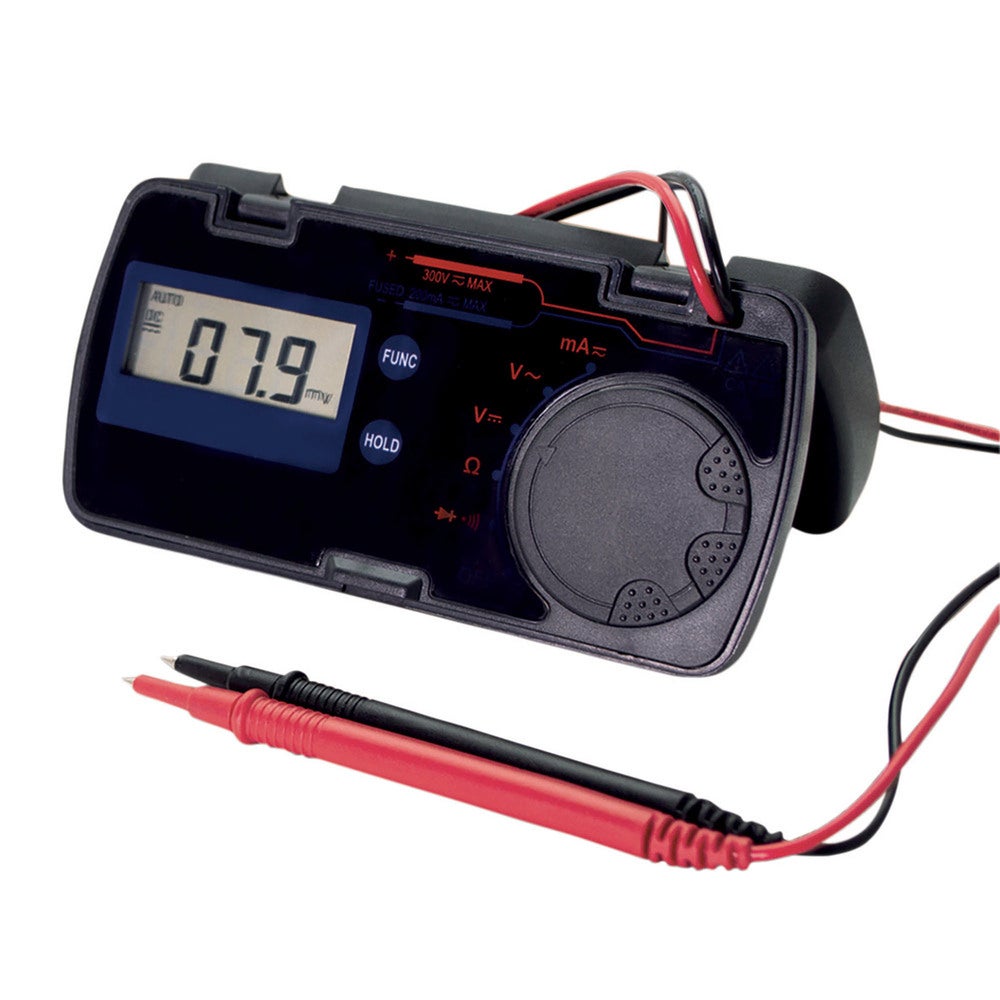 C'est le testeur digital de poche, ultra plat et léger, équipé d'un boîtier rigide. Il propose 5 fonctions : mesure la tension, l'intensité, la résistance, test de diode et continuité avec buzzer. Pratique avec ses cordons intégrés et son calibrage automatique.