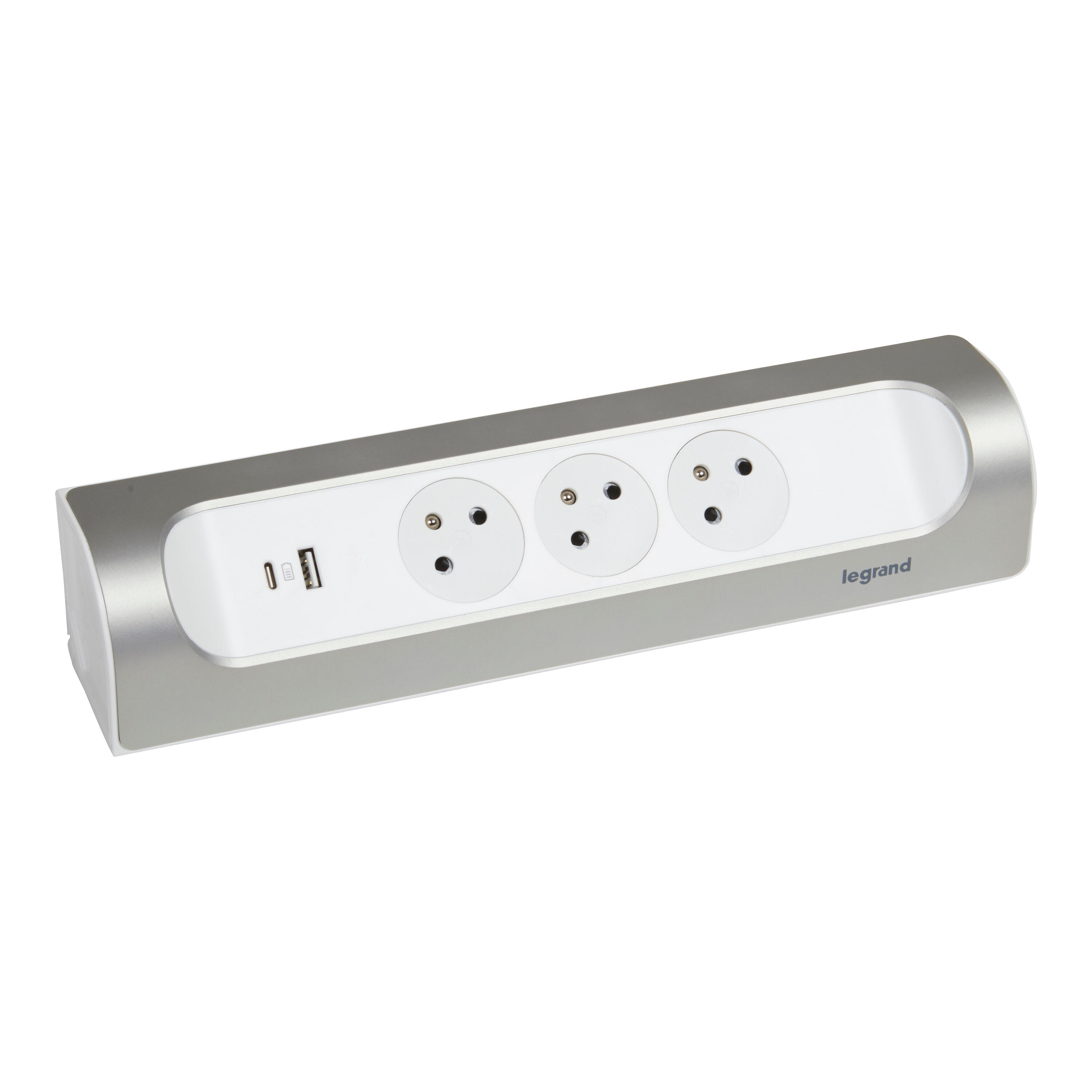 Multiprise Legrand avec prise affleurante, qui allie design, sécurité et évite l'accumulation de poussière. Multiprise offrant plusieurs possibilités d'installation : en vertical ou en horizontal, sur le plan de travail ou dans un angle. Fixation sur le plan de travail ou sur le mur par vis, ou par double face (inclus)