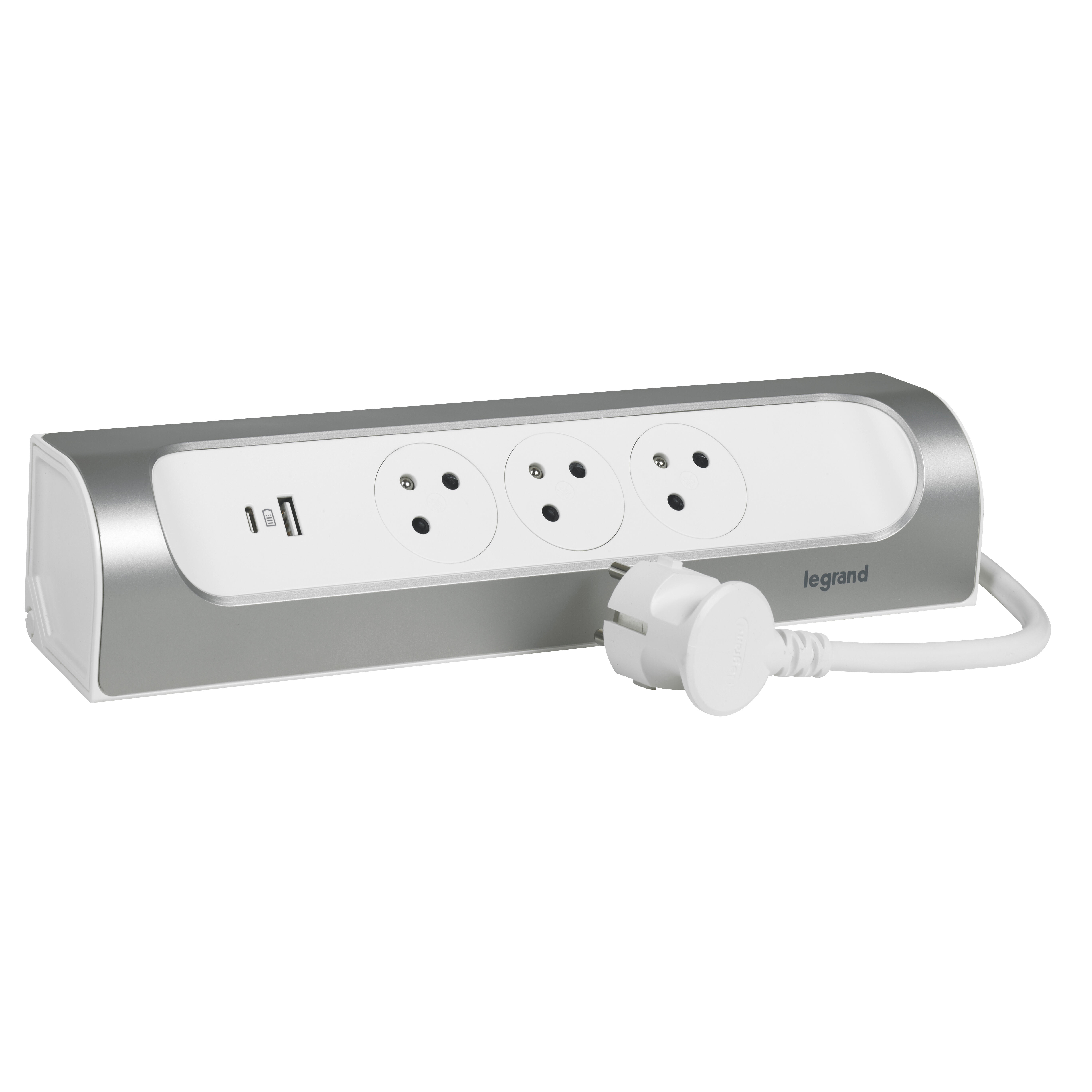 Multiprise d'angle 3 prises 1m avec 1 USB-A + 1 USB-C aluminium LEGRAND