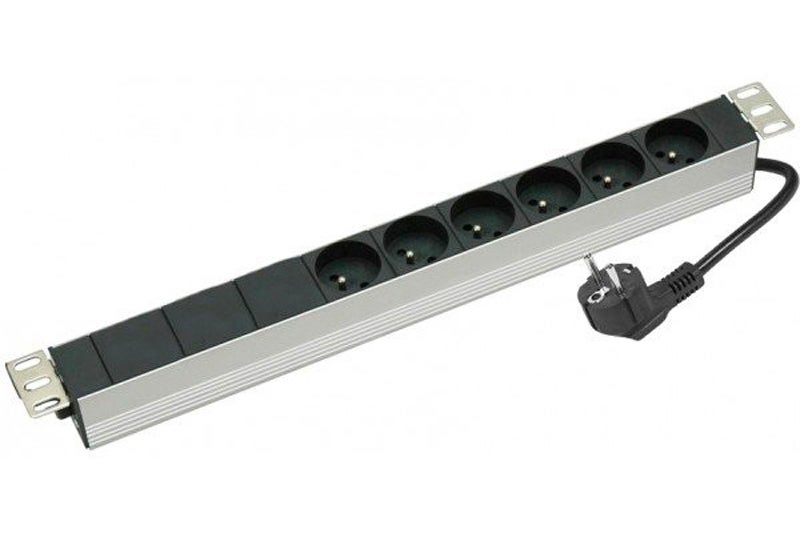Multiprise rackable 6 prises 19 poucesBandeau de prises électriques rackable dans un coffret informatique au format 19'Spécifications :- Boitier en aluminium avec équerres de fixation orientables- Câble H05VV-F 3x1.5 mm2 avec fiche française CEE7 male - Longueur du câble : 2.50 m- Puissance maximum : 3 680 W (16A - 230V)- Protection : Oui (Enfants)- Indice IP : IP20