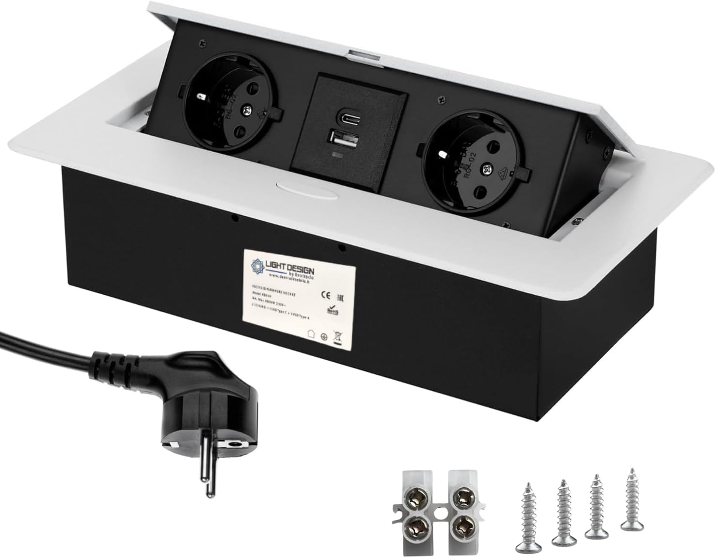 📦 CONTENU DE LA BOÎTE – La boîte contient 1 multiprise encastrable couleur blanc avec 2 prises Schuko, 2 prises USB et câble de 1,5 m, prête pour une installation rapide sur bureau ou plan de travail pour un usage immédiat.