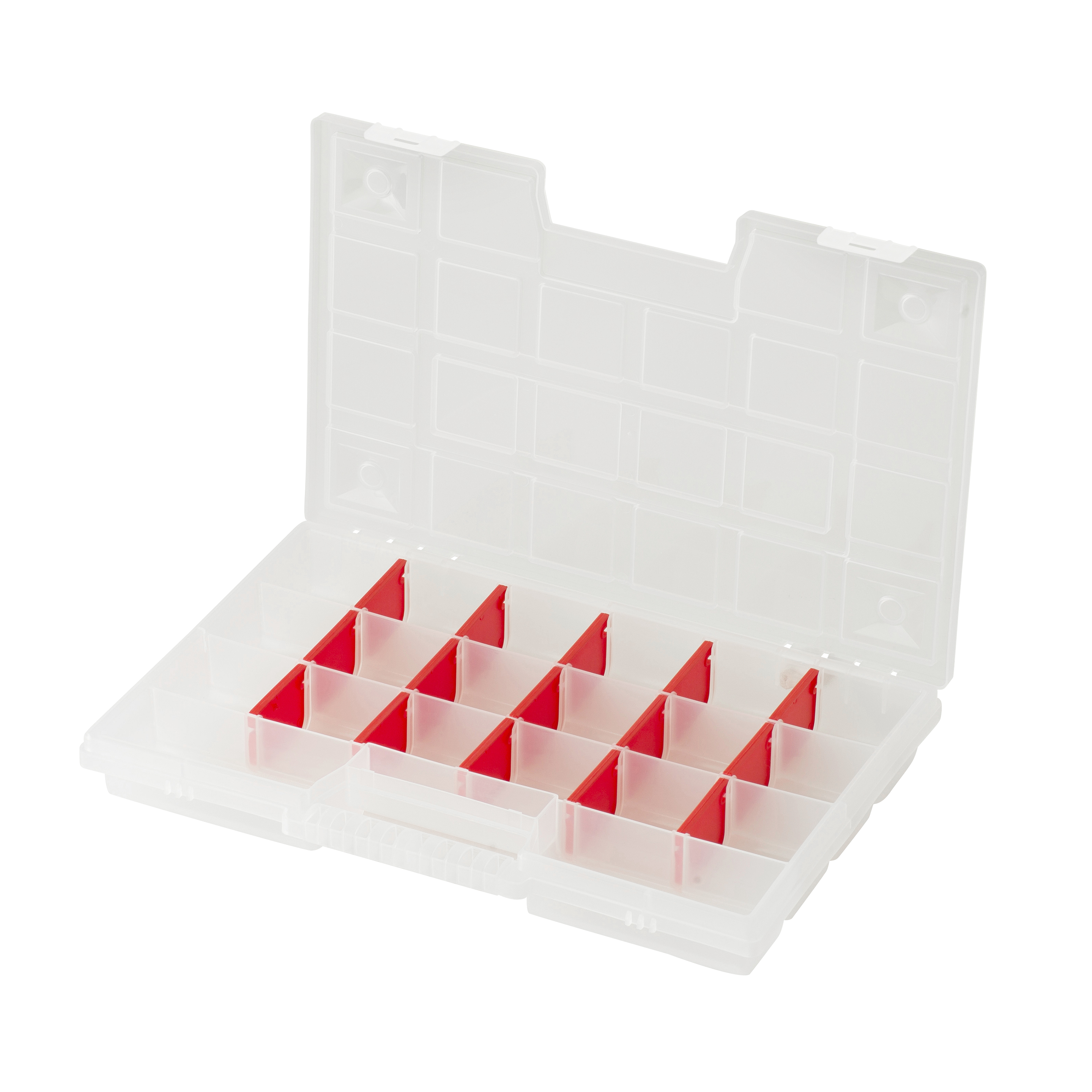 Cet organisateur polyvalent est salué pour son adaptabilité, permettant aux utilisateurs d'ajuster la taille des compartiments selon leurs besoins de stockage. Les clients soulignent sa solidité, sa durabilité et sa valeur, ainsi que le design transparent qui permet une visibilité facile du contenu. Beaucoup rapportent utiliser l'organisateur pour une variété de fins au-delà du simple rangement de matériel, comme le stockage de pièces de jeu ou de bijoux, indiquant sa nature pratique et multifonctionnelle. Dans l'ensemble, le consensus est que c'est un excellent outil d'organisation qui aide les utilisateurs à garder leurs petits articles bien rangés et facilement accessibles.