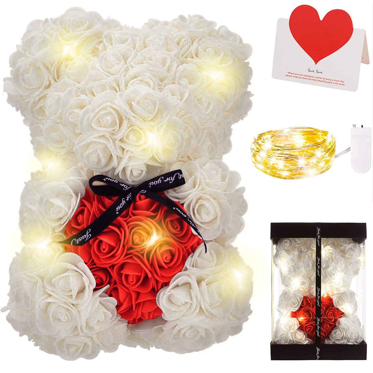 Ours en Roses Blanc avec Cœur Rouge, Ours de Fleurs LED 25cm, Cadeau Romantique pour Elle, Anniversaire, Fiançailles, avec Boîte & Carte, Fait Main