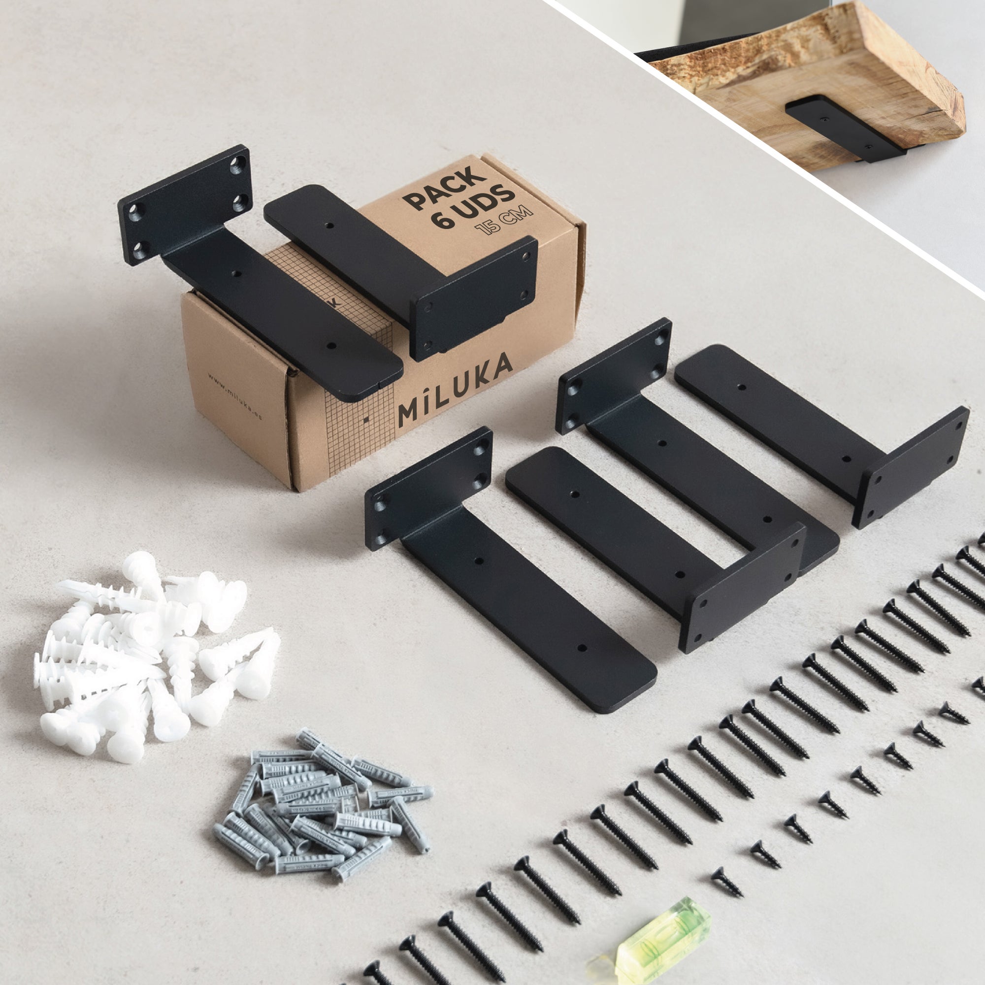 Pack 6 Équerres métalliques 15 cm pour étagères | Support résistant 70 kg | Design industriel noir | Fixation cachée, installation facile