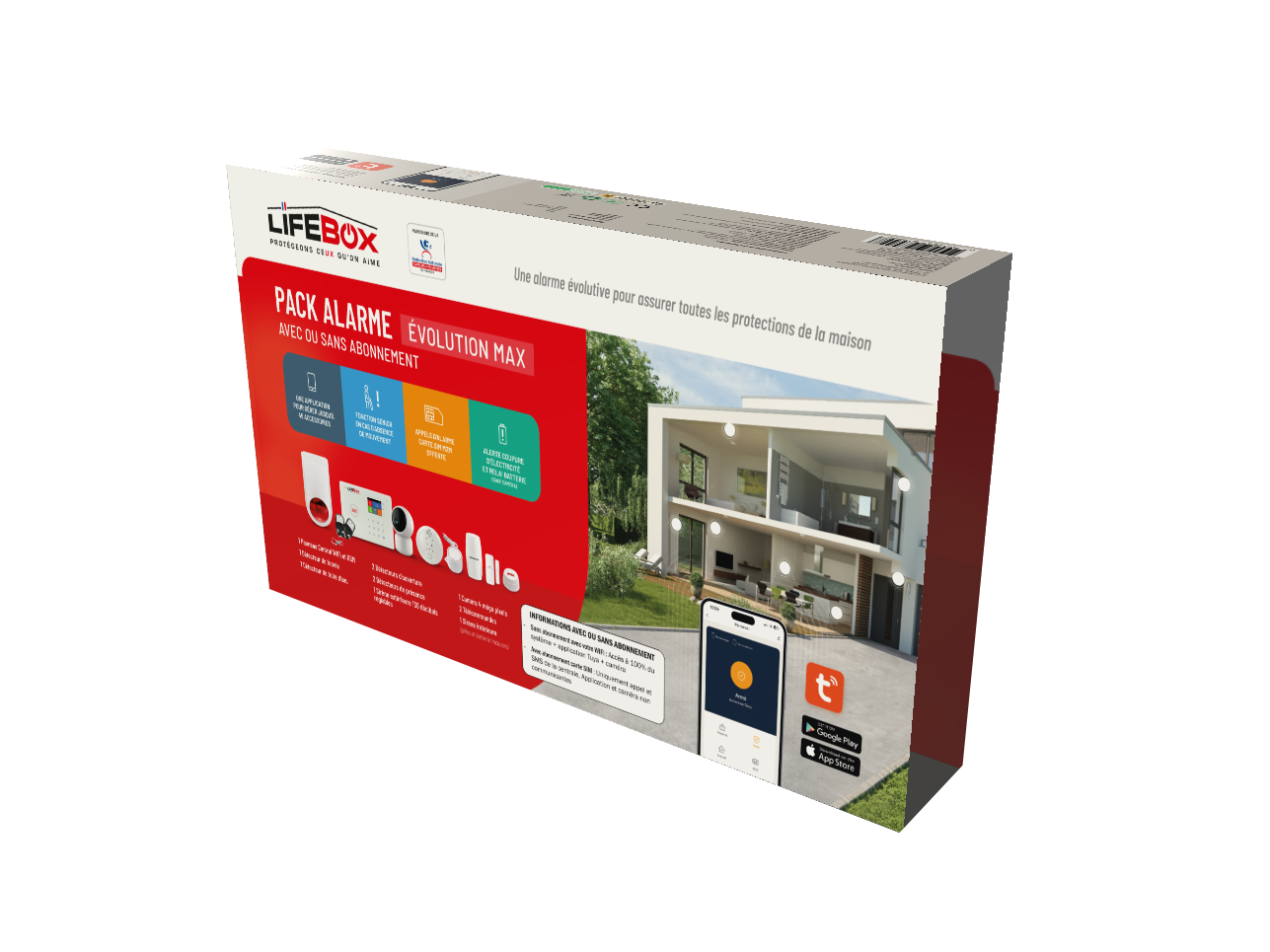 Pack contenant : un panneau centrale Wifi, un détecteur de fumée, un détecteur de fuite d’eau, deux détecteurs d'ouverture de porte ou de fenêtre, deux détecteurs de présence par infrarouge, une sirène extérieure filaire avec batterie de secours, une sirène intérieure, deux télécommandes, une carte SIM M2M, un sticker site surveillé et une caméra 4mp. Ce pack alarme est utilisable en wifi avec l’application TUYA SMART, et ou en GSM avec abonnement en sus de 6,90 euros TTC. Outre sa simplicité d’utilisation, il permet d’ajouter des dizaines d’accessoires, de gérer sa sécurité domestique personnellement mais surtout d’organiser des scénarios comme si la caméra détecte un mouvement ou un bruit, le signal est transmis à l’alarme qui déclenchera les sirènes et alertera par notification ( en wifi ) et par appels et sms si utilisation avec la car sim. Le pack alarme EVOLUTION MAX de LIFEBOX au design impressionnant fait partie des alarmes au panneau centrale le plus fin du marché. Pensée par Lifebox, elle est évolutive avec plusieurs dizaines d’accessoires comme sabot de porte de garage, détecteur de mouvement immunité animal moins de 10 kilos, ou encore détecteur de gaz, cette alarme vous accompagnera au quotidien pour une sécurité optimale
