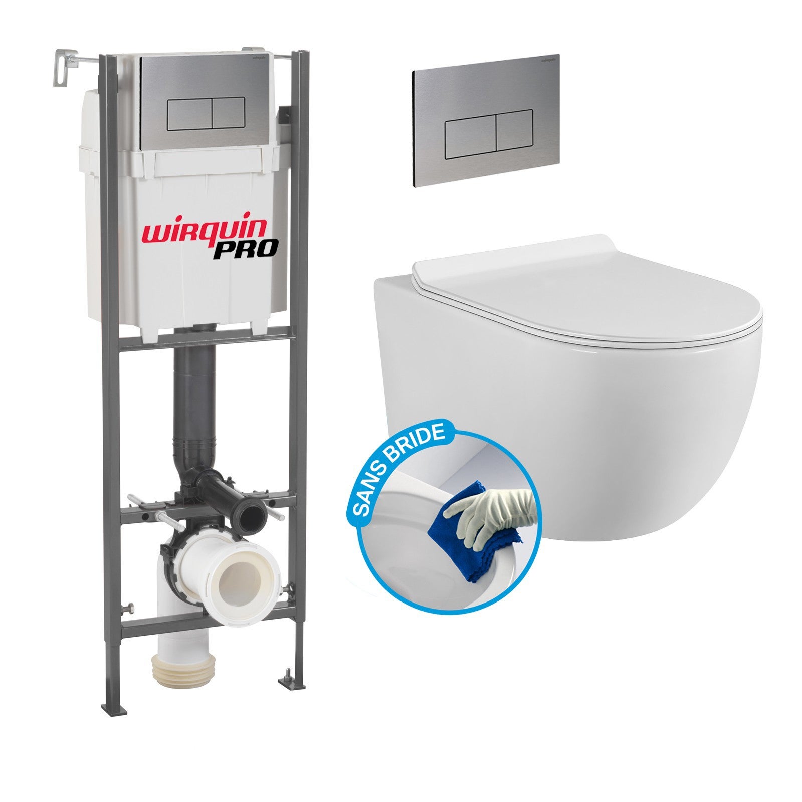 Pack Complet WC Sans Bride Bati INITIO + Cuvette blanche suspendu sans bride + Plaque Chromée DESIGN