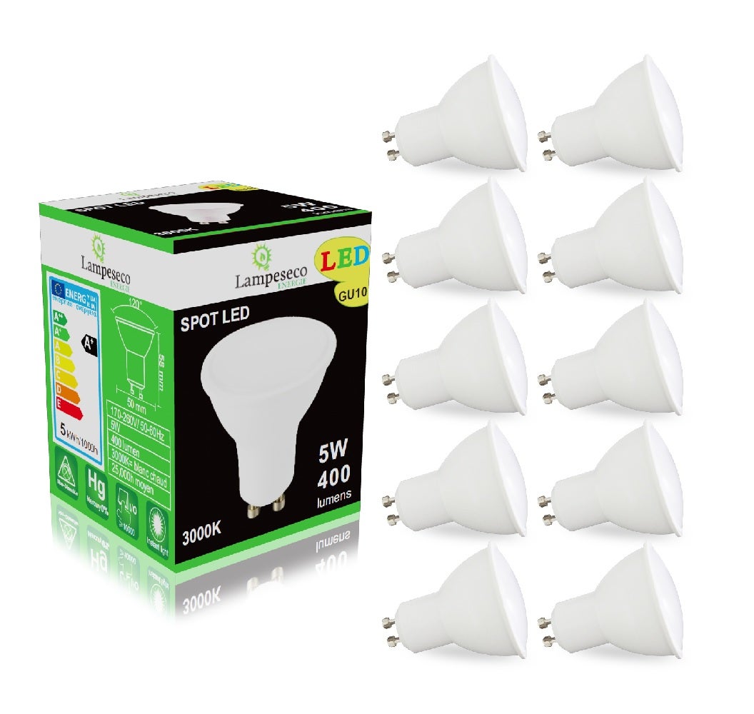 Pack de 10 Ampoules GU10 5W Blanc Chaud 3000K 230V Dimensions standards: (H) 58 mm x (D) 50 mm – un remplaçant direct pour les ampoules halogène standard GU10. En consommant seulement 5 watts d’électricité elles ont l’équivalence d’une ampoule halogène d'environ 50W. Un grand angle de diffusion de 120° font qu’elles sont idéal pour la plupart des espaces de vie ou un maximum de lumière est souhaité. La façade en plastique blanc opaque garanti une diffusion de lumière régulière tout en réduisant les ombres et reflets. Convient à une utilisation avec les supports encastrables. La couleur de lumière est blanc chaud 3000K. Pas compatible avec variateur.