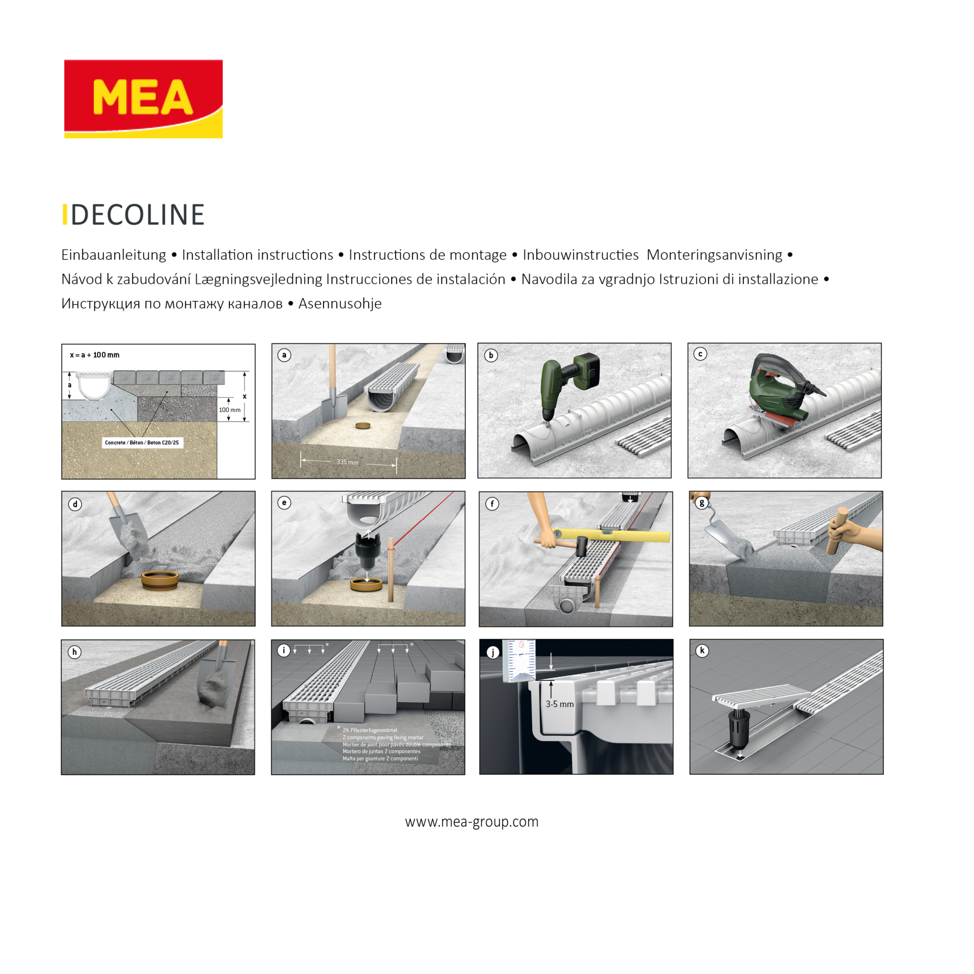 Installation simple et rapide : le profil de nos caniveaux DECOLINE permet un ancrage simple et rapide dans le lit de béton. Pour plus de confort, les consignes de pose MEA (fournies avec les caniveaux) vous guident pas à pas dans la mise en place de votre système de drainage.