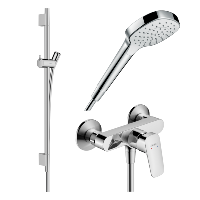 Pack mitigeur douche mécanique HANSGROHE Logis + Barre Unica S Puro + flexible + Pommeau Croma Select E blanc/chromé