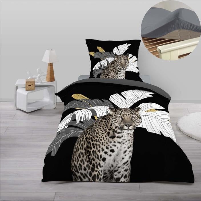 Ce pack parure 1 personne + drap housse se compose de : Housse de couette enfant 140x200 cm coton + 1 taie d’oreiller 63 x 63 cm + Drap housse Gris 90x190 cm bonnet 30 cm 100% coton 57 fils Motif : Léopard Matière : 100% coton parure 42 fils / drap housse 57 fils Finition : Fermeture boutons pression pour un maintien parfait de la couette Entretien : Lavage à 40° - Séchage modéré - Repassage à 150°